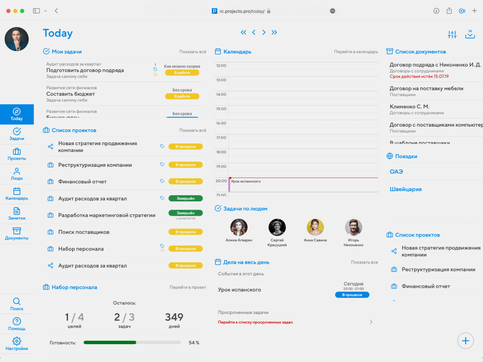 В одном окне собраны списки дел, канбан-доски, регламенты и база знаний. С помощью сервиса можно управлять проектами и документацией.