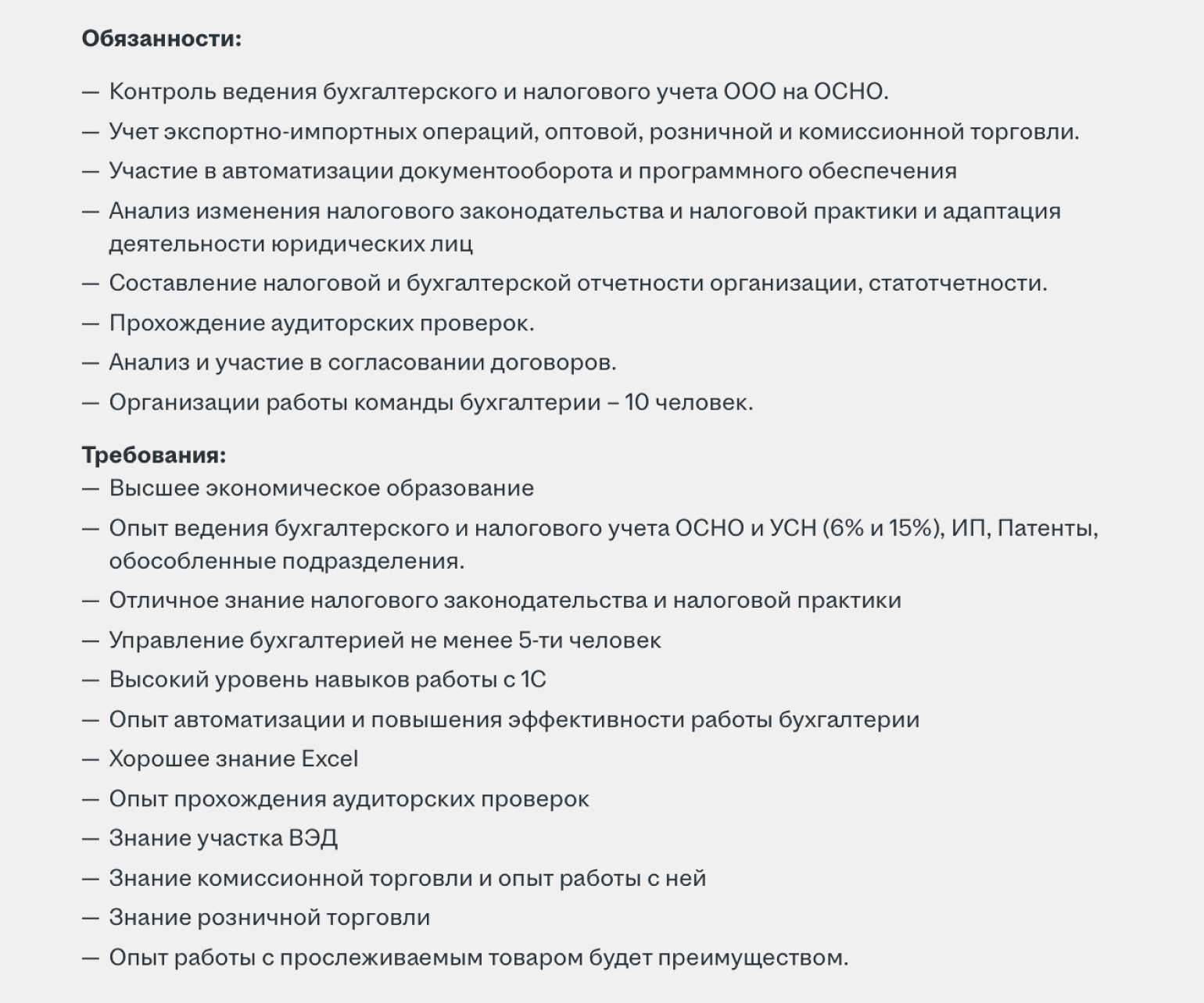 В первой вакансии главному бухгалтеру предлагают зарплату от 170 тысяч рублей в месяц на руки. Формат работы — удалённый, полный день. От кандидата ждут не только ведения бухгалтерского и налогового учёта, но и управления всей командой бухгалтеров из десяти человек.