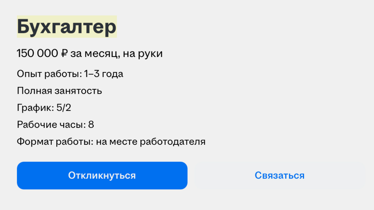 Во второй вакансии главбуху предлагают зарплату от 80 до 150 тысяч рублей в месяц до вычета налогов. Это тоже удалённая работа на полный день, но в другом формате: бухгалтер должен вести несколько юрлиц, формировать отчётность, начислять зарплату и взаимодействовать с заказчиками. Компания предлагает обучение, развитие и гибкий уровень загрузки, но управленческих функций здесь меньше, поэтому и зарплата ниже.
