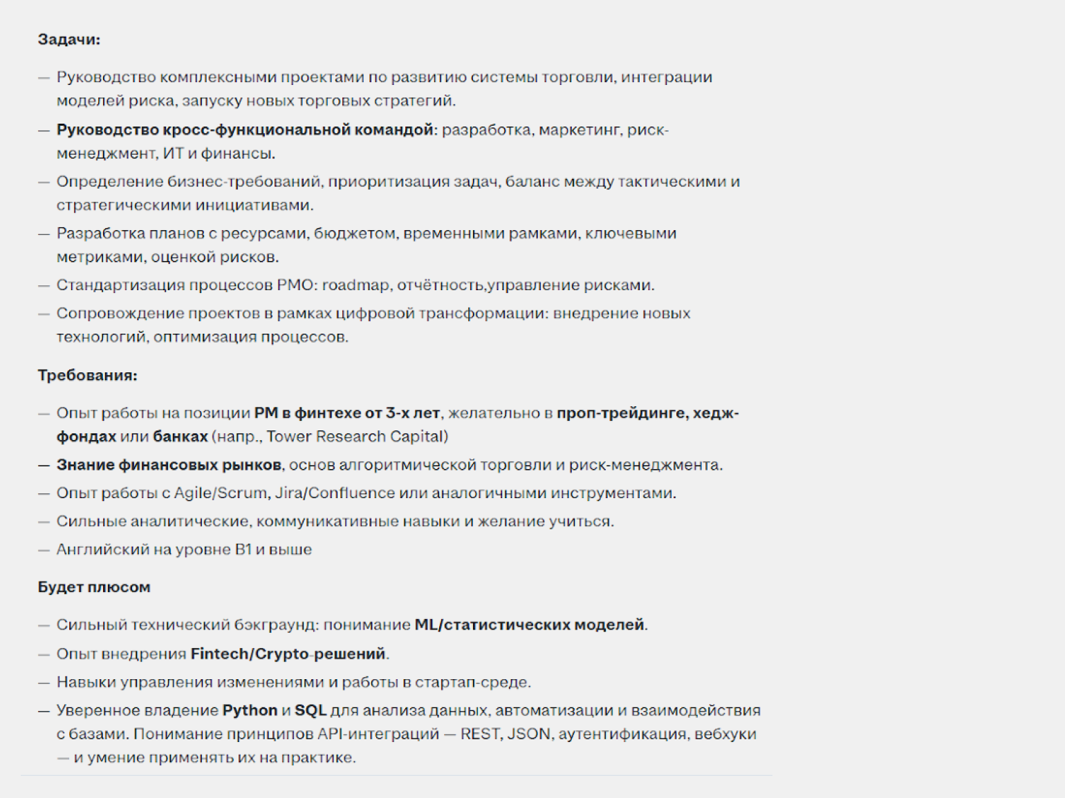 Хард-скиллы: знание методологий управления проектами (Scrum, Kanban, Waterfall, Hybrid), умение работать с инструментами вроде Jira, Confluence, MS Project, Notion и диаграммами Ганта. Дополнительным плюсом будет базовое понимание технологий — от API до CI/CD и микросервисов. Такой техминимум помогает разговаривать с разработчиками на одном языке и быстрее находить решения.