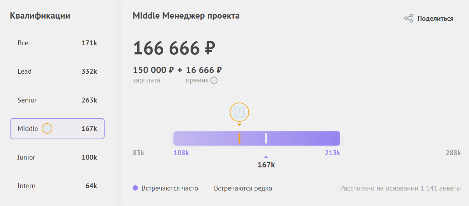 - Middle — 167 000 рублей. Менеджеры среднего уровня уже самостоятельно ведут проекты от начала до конца, координируют команду, общаются с заказчиком и отвечают за результат. В их зону ответственности также входят сроки, бюджет и качество готового продукта.