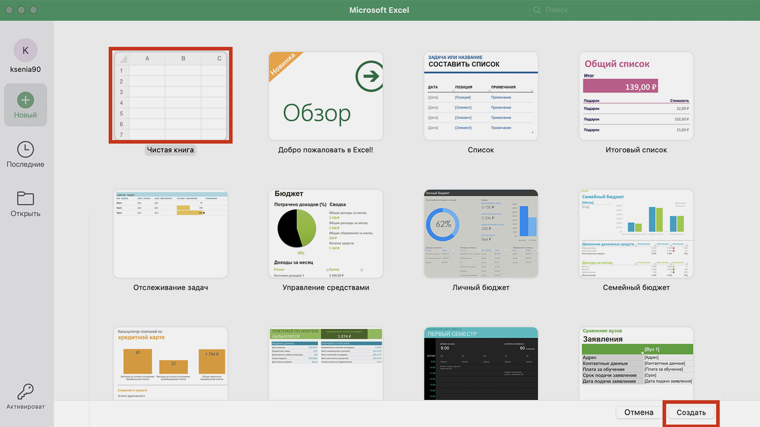 Запустите программу Excel, выберите «Чистая книга» и нажмите на «Создать» в правом нижнем углу.