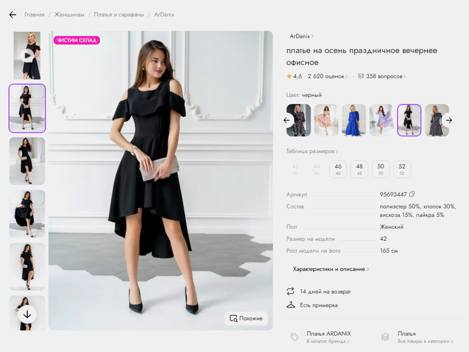 В рассматриваемой «карусели» платьев абсолютно разные цвета, фасоны, материалы. У каждой модели разные показатели остатка товара, разное SEO, разный рейтинг.