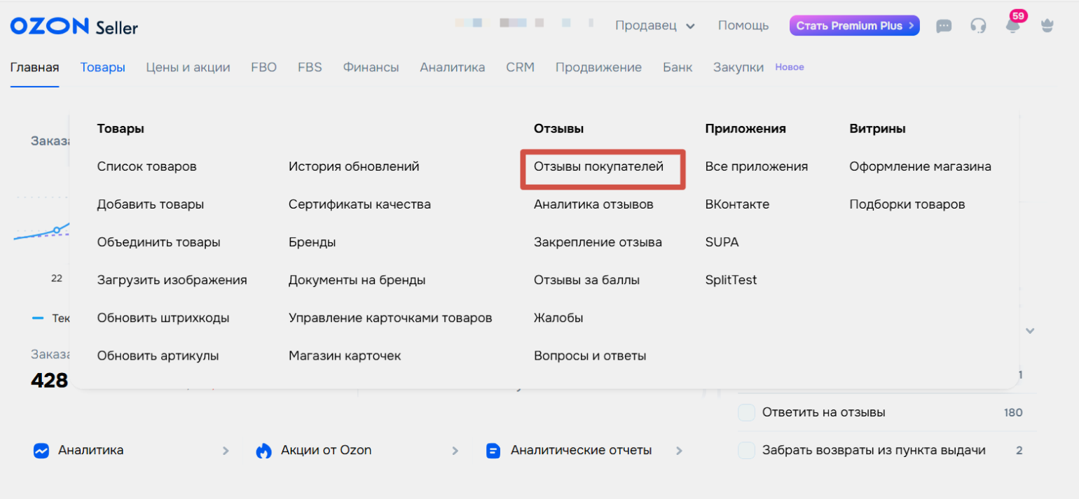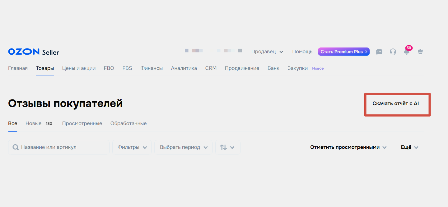 На Ozon есть свой ИИ-инструмент для анализа отзывов. Но у него есть недостаток: он плохо генерирует гипотезы и работает с минусами продукта. Поэтому лучше использовать стороннюю нейросеть. Выгрузить отзывы на Ozon можно во вкладке «Товары» → «Отзывы покупателей». Нажмите на «Скачать отчёт с AI» — и получите файл.