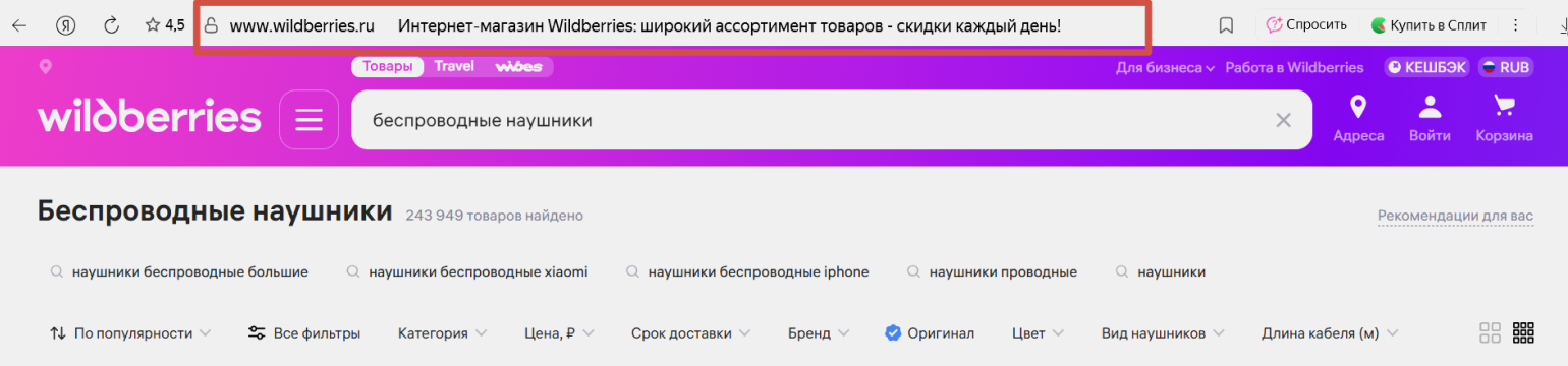 Вставьте ключевой запрос в поисковую строку маркетплейса, для которого хотите сделать анализ. Затем скопируйте адресную строку страницы с поисковой выдачей.
