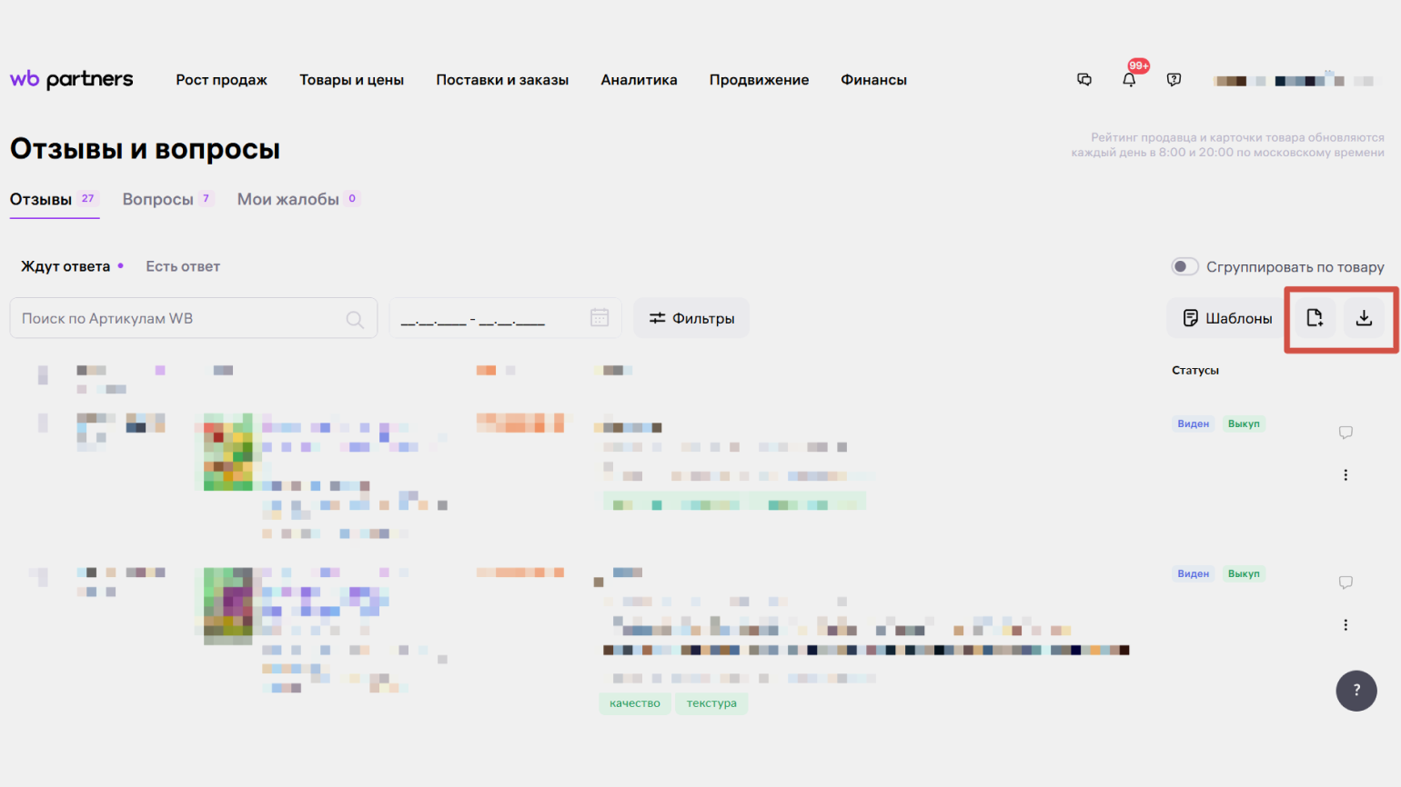 Выгружаем файл с отзывами. Это можно сделать в личном кабинете на маркетплейсе. На Wildberries, например: в разделе «Товары и цены» → «Отзывы и вопросы». Нажмите на кнопку «Сформировать файл», а затем на «Сохранить файл».