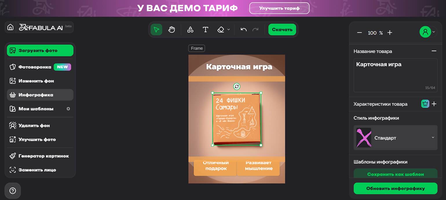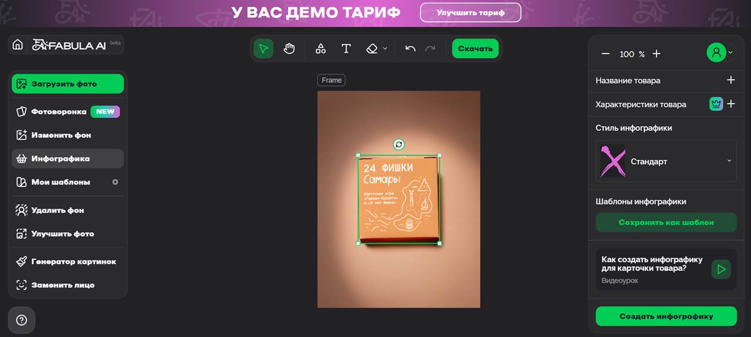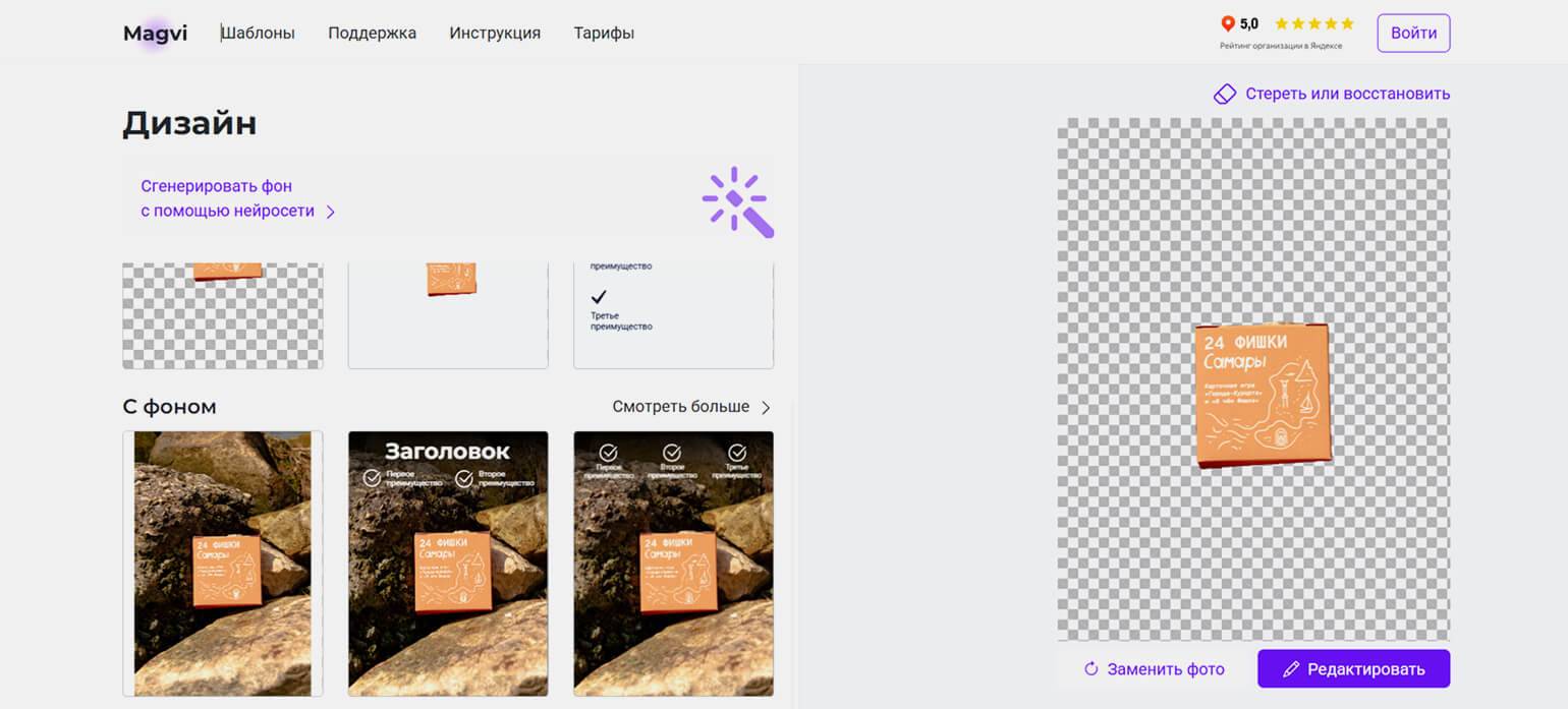 Это конструктор специально для создания карточек товаров на маркетплейсах. В нём можно удалять фон с фото, изменять его, добавлять элементы инфографики, использовать шаблоны.