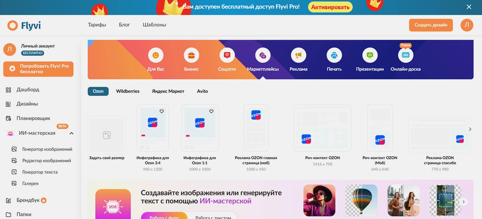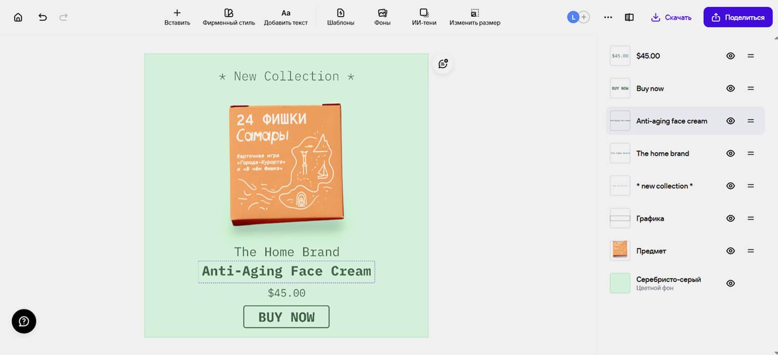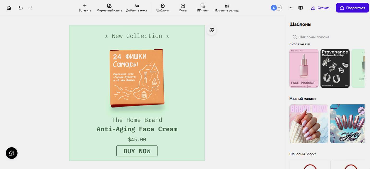 Это конструктор специально для создания карточек товаров на маркетплейсах. В нём можно удалять фон с фото, изменять его, добавлять элементы инфографики, использовать шаблоны.