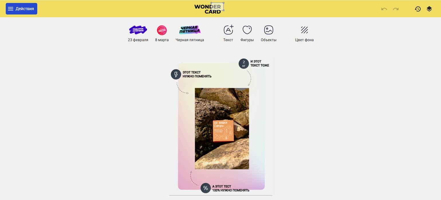 Зависит от потребностей. Например, если у вас несколько товарных позиций, можно использовать сервисы, которые позволяют скачивать изображения без водяного знака в бесплатном тарифе, — вроде Magvi. Если нужно создавать похожие карточки, можно выбрать WonderCard или подобные ему сервисы, в которых есть 1–2 шаблона и скачивание без вотермарок.