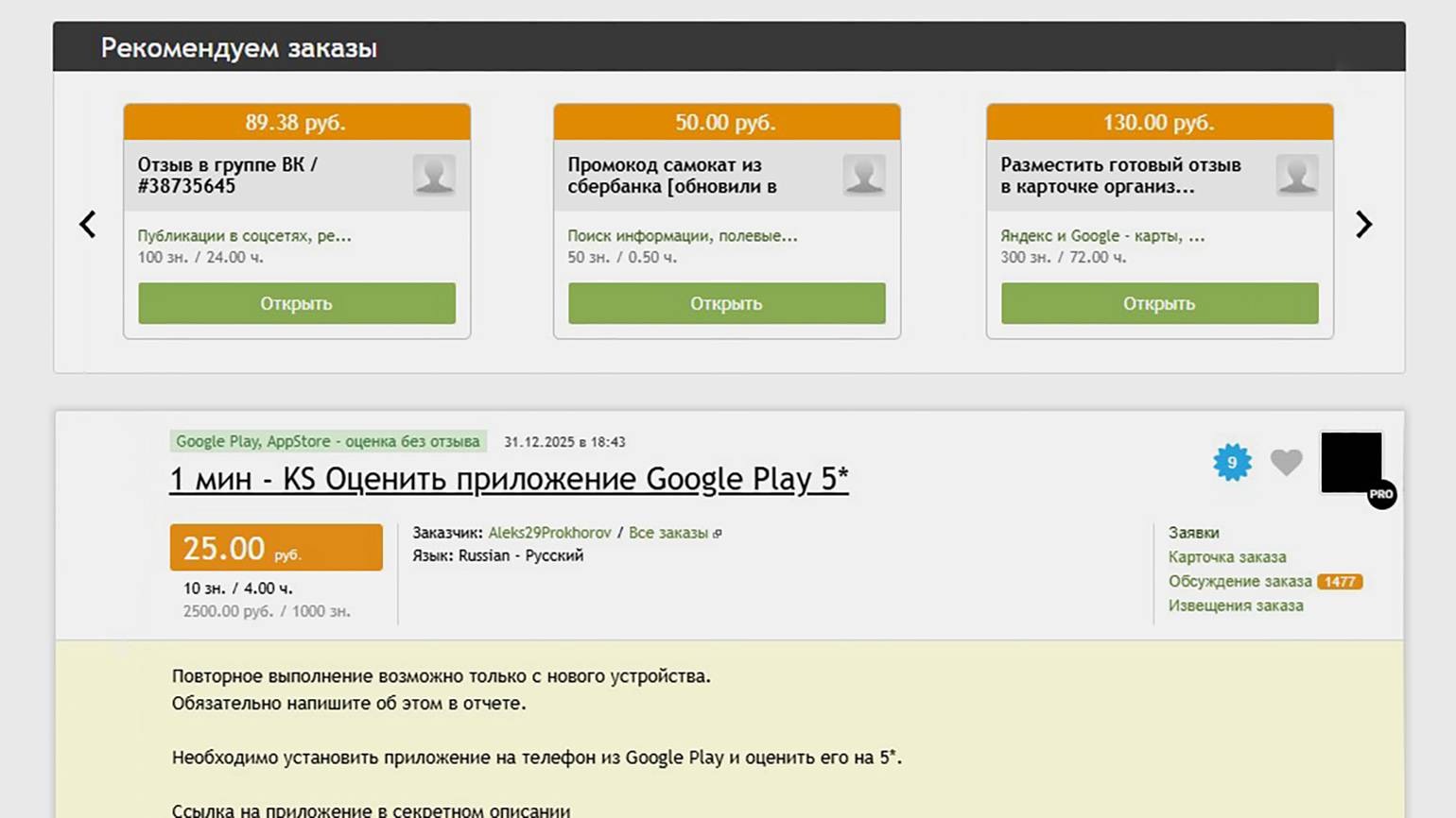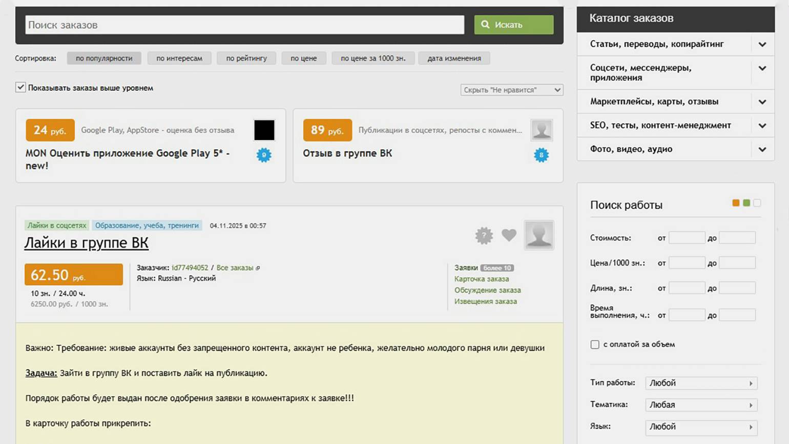 Не все заказы попадают в каталог. Клиент может дать индивидуальный заказ, если ему понравилось качество работы, — тогда задача отобразится только у исполнителя.