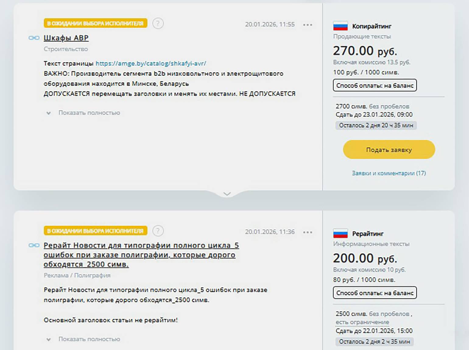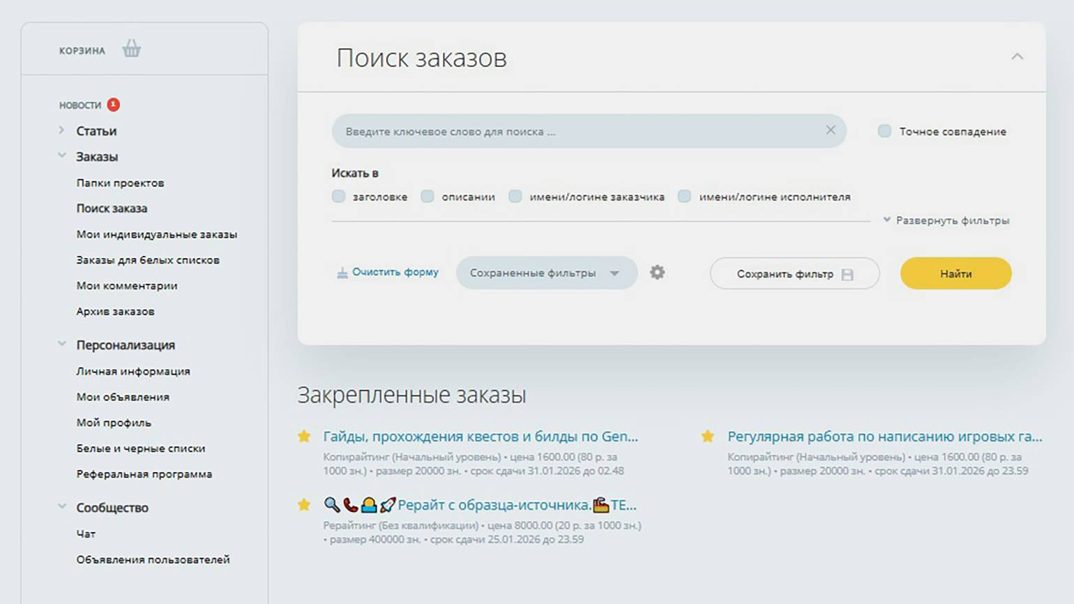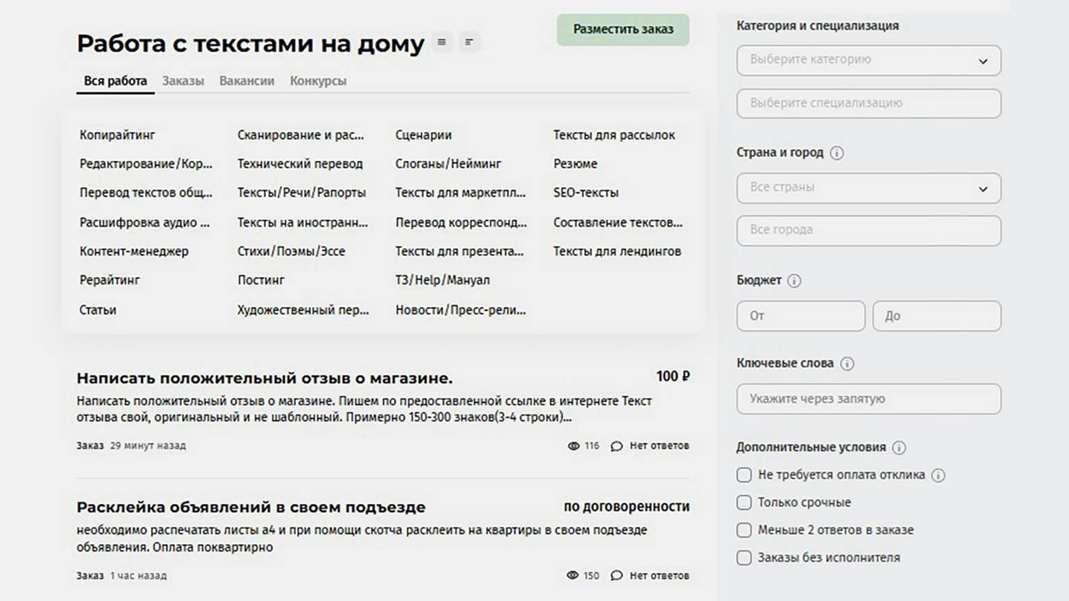 - специфику — на одной бирже может быть больше заказов на статьи, на другой — на описания товаров для маркетплейсов, и лучше выбрать площадку, на которой больше задач на близкие вам форматы;