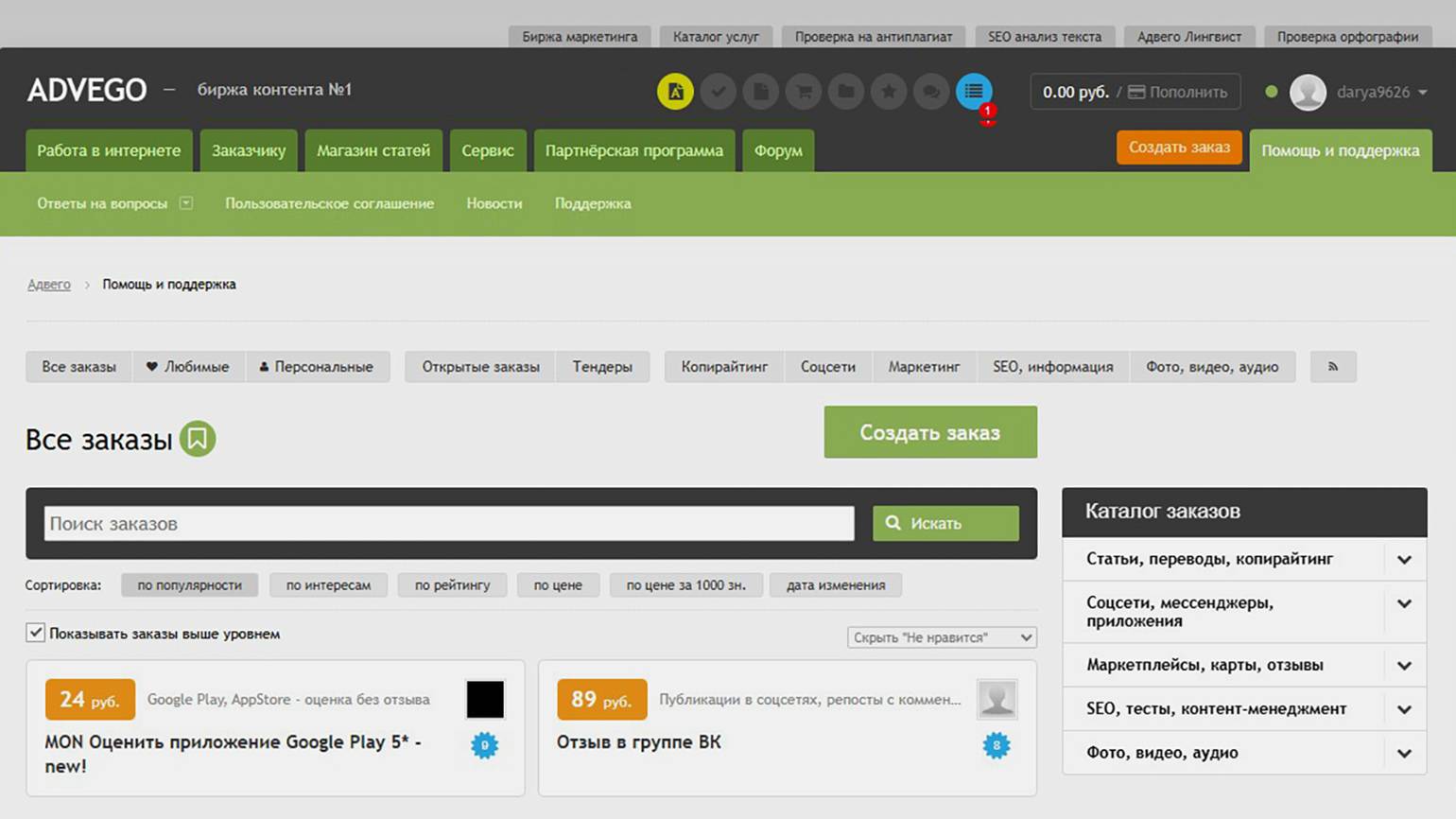 Advego — одна из старейших бирж с относительно сложным, на мой взгляд, интерфейсом. С неё начинала я. На ней до сих пор есть заказы, которые можно брать сразу, не отправляя заявку и не дожидаясь её одобрения.