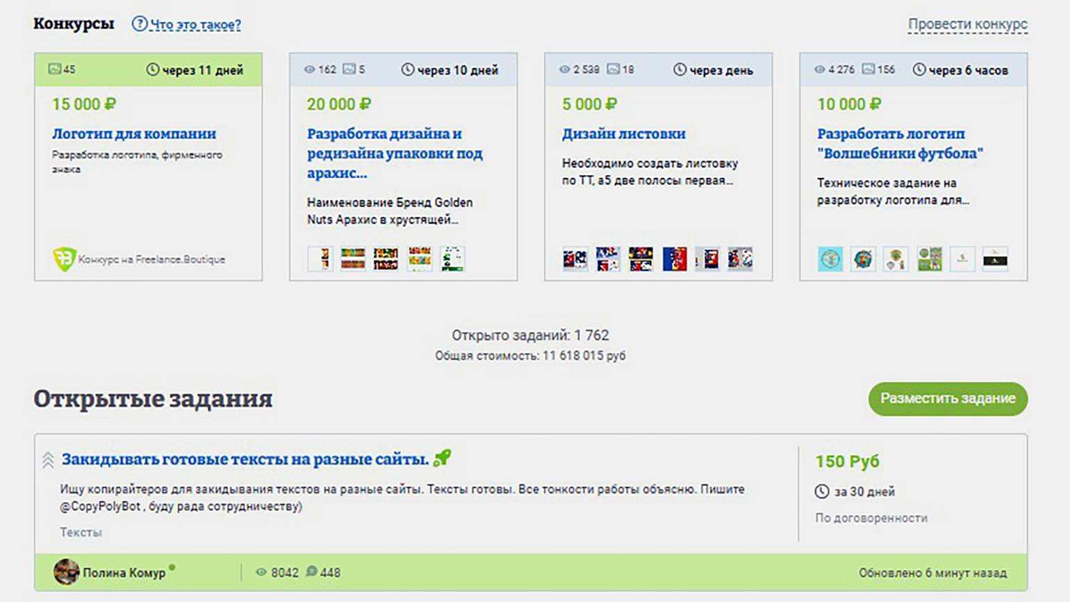 Участвовать в конкурсах и тендерах. Их могут проводить и заказчики, и администрация площадок. Для участия в них нужно создать контент — например, сделать слоган или придумать название компании, написать рассказ или разработать структуру лендинга.
