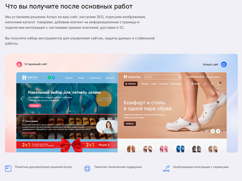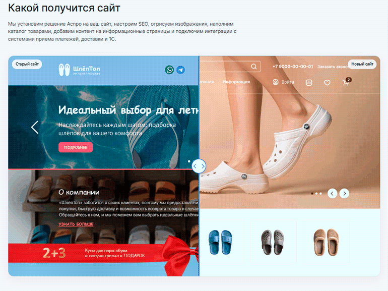 Также мы добавили интерактивную шторку «До/После» для фотографий, чтобы наглядно показать изменения при запуске нового сайта. Благодаря виджету изображения стали больше — можно лучше разглядеть детали. Код получился универсальным, поэтому планируем использовать его и на других страницах сайта — например, в кейсах.