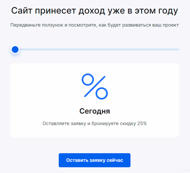 Для акционного лендинга мы создали интерактивный блок. Пользователь двигает ползунок и видит, как будет развиваться проект, если он закажет разработку сайта сейчас.