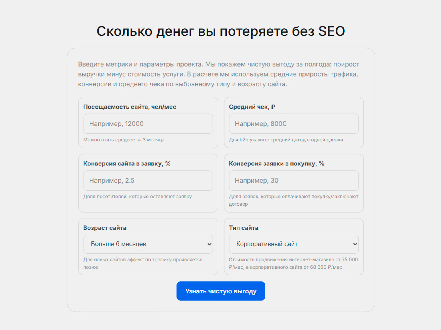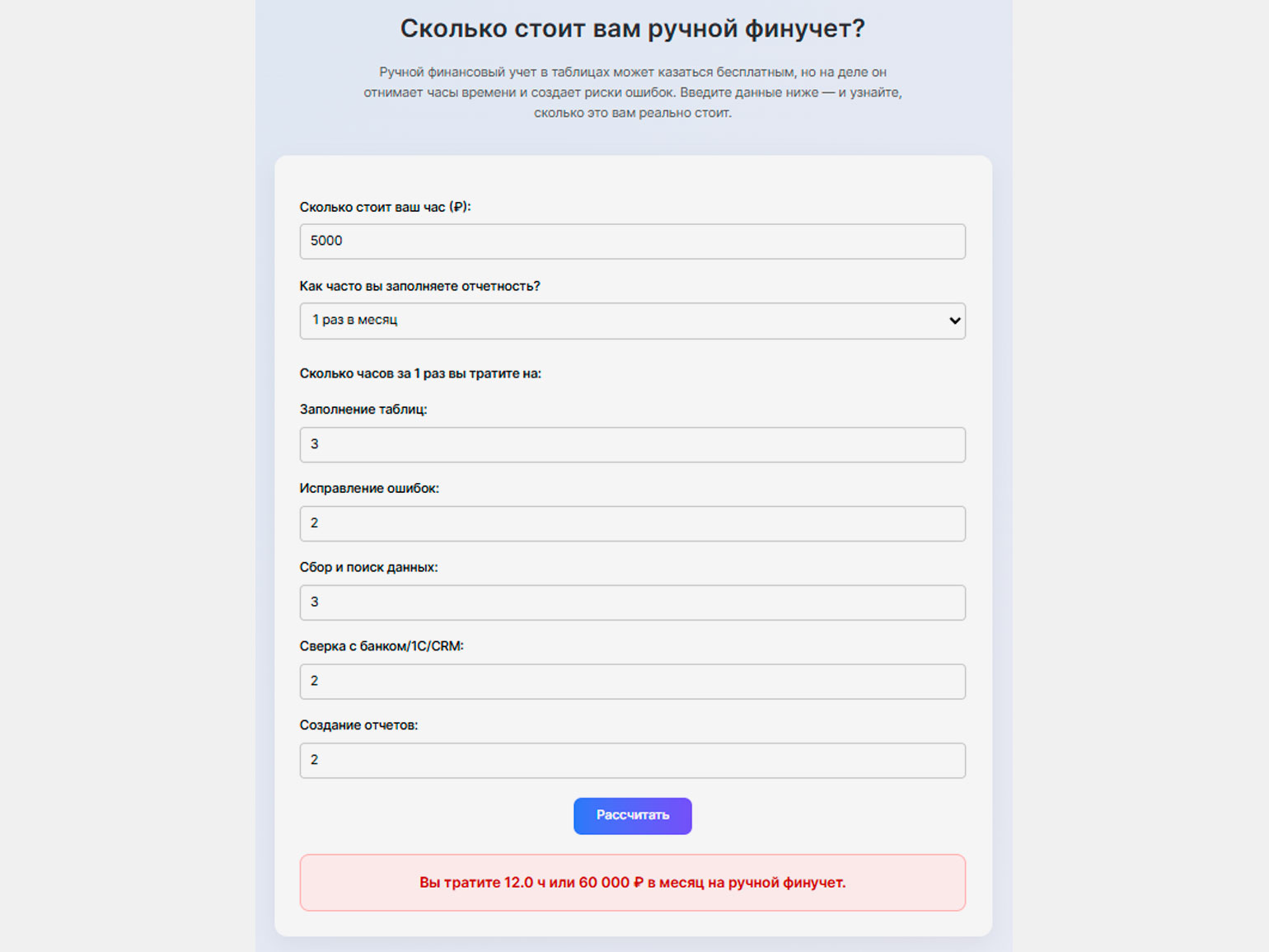 Для нашего финансового направления мы создали простой калькулятор для расчёта затрат на финучёт. Цель — быстро показать преимущество нашего сервиса перед ручным ведением Excel-таблиц. Программиста привлекали только для вёрстки страницы.