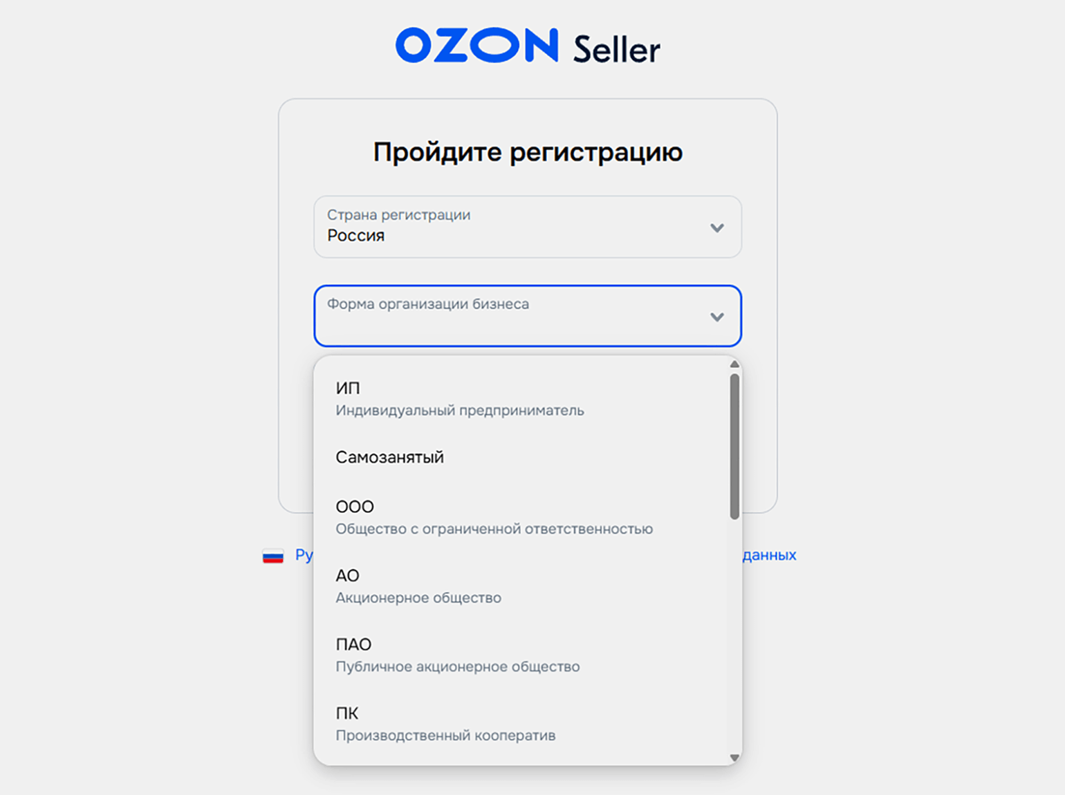 На первом экране формы регистрации выберите страну и форму организации бизнеса. Можно торговать как самозанятый, ИП и юридическое лицо — причём доступен выбор разных форм юрлиц.