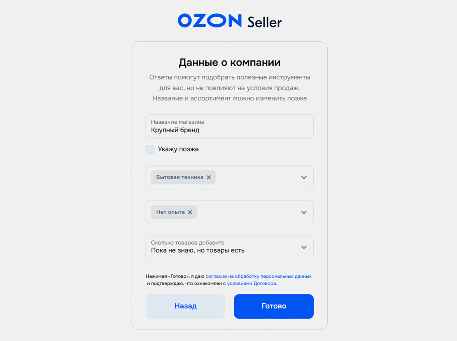 В следующем окне укажите информацию о своём магазине. Рекомендуем придумать хорошее, продающее название для магазина — оно не должно совпадать с названием вашего юридического лица. Именно то, что вы здесь напишете, будут видеть покупатели в карточках товаров и на вашей странице.