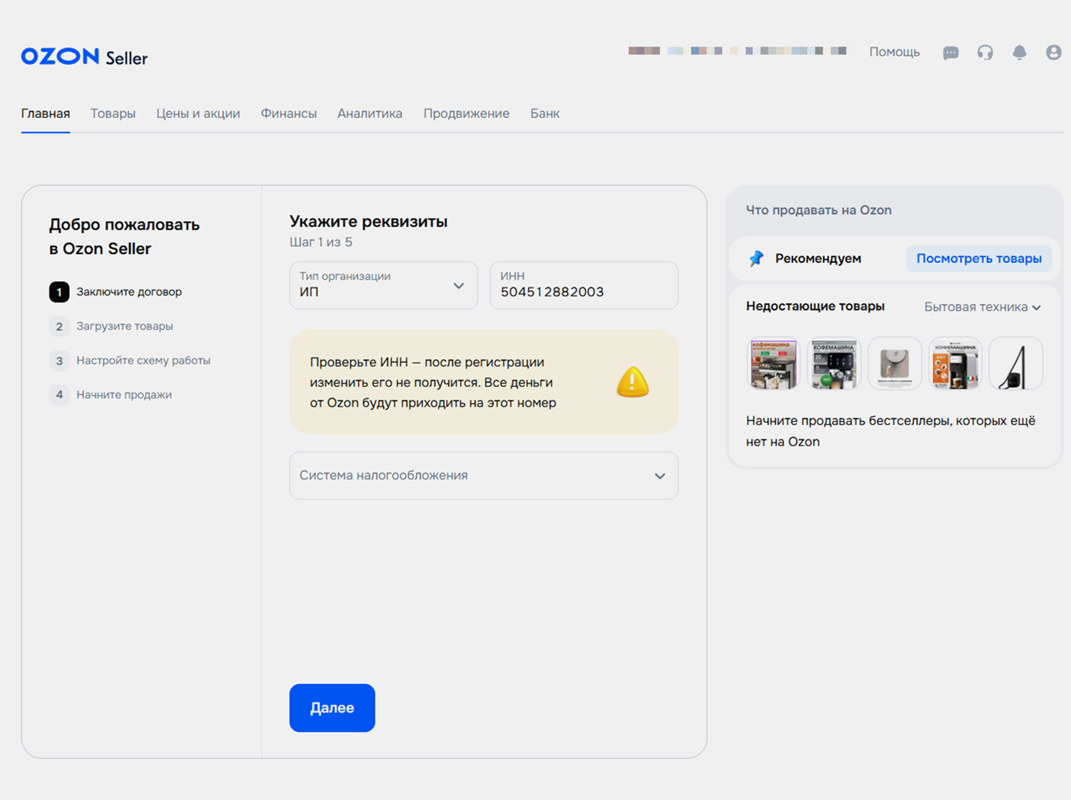 После регистрации нужно будет заполнить реквизиты — в частности, указать ИНН, — а также заключить договор, загрузить товары и настроить схему работы. После этого можно начать продавать: загруженные вами товары появятся на площадке.