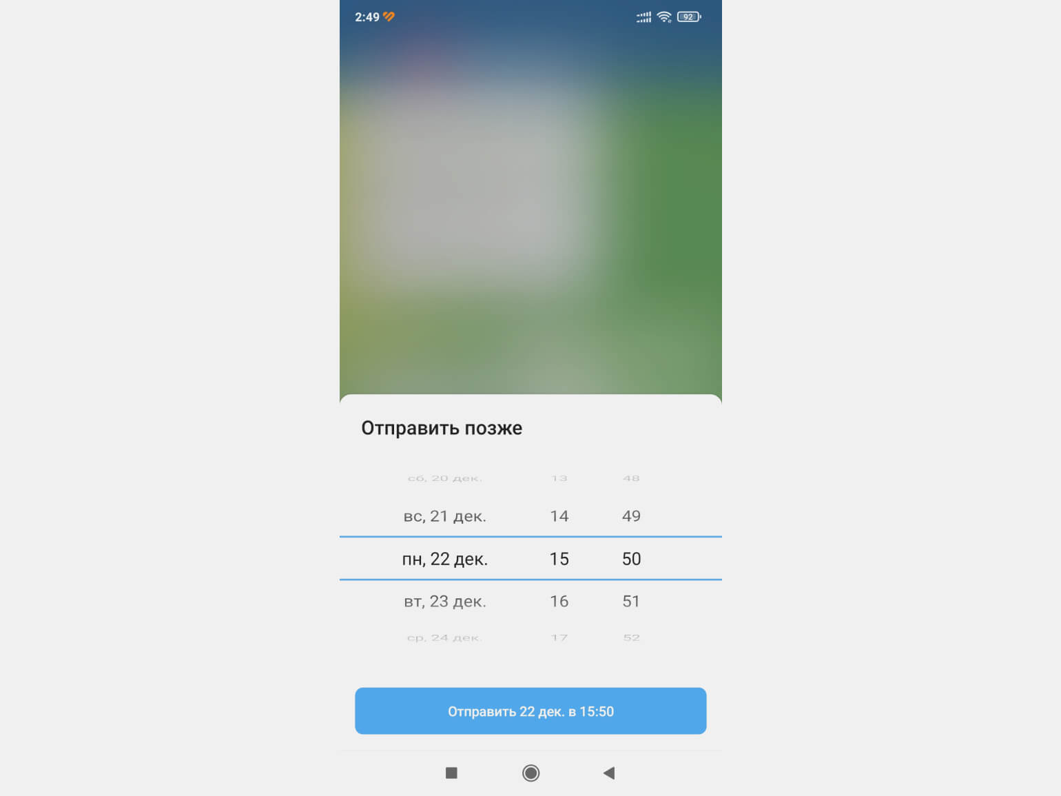 Так же функция работает и для репостов. А чтобы отправить позже голосовое сообщение или кружок, после его записи нажмите на паузу и зажмите значок отправки.