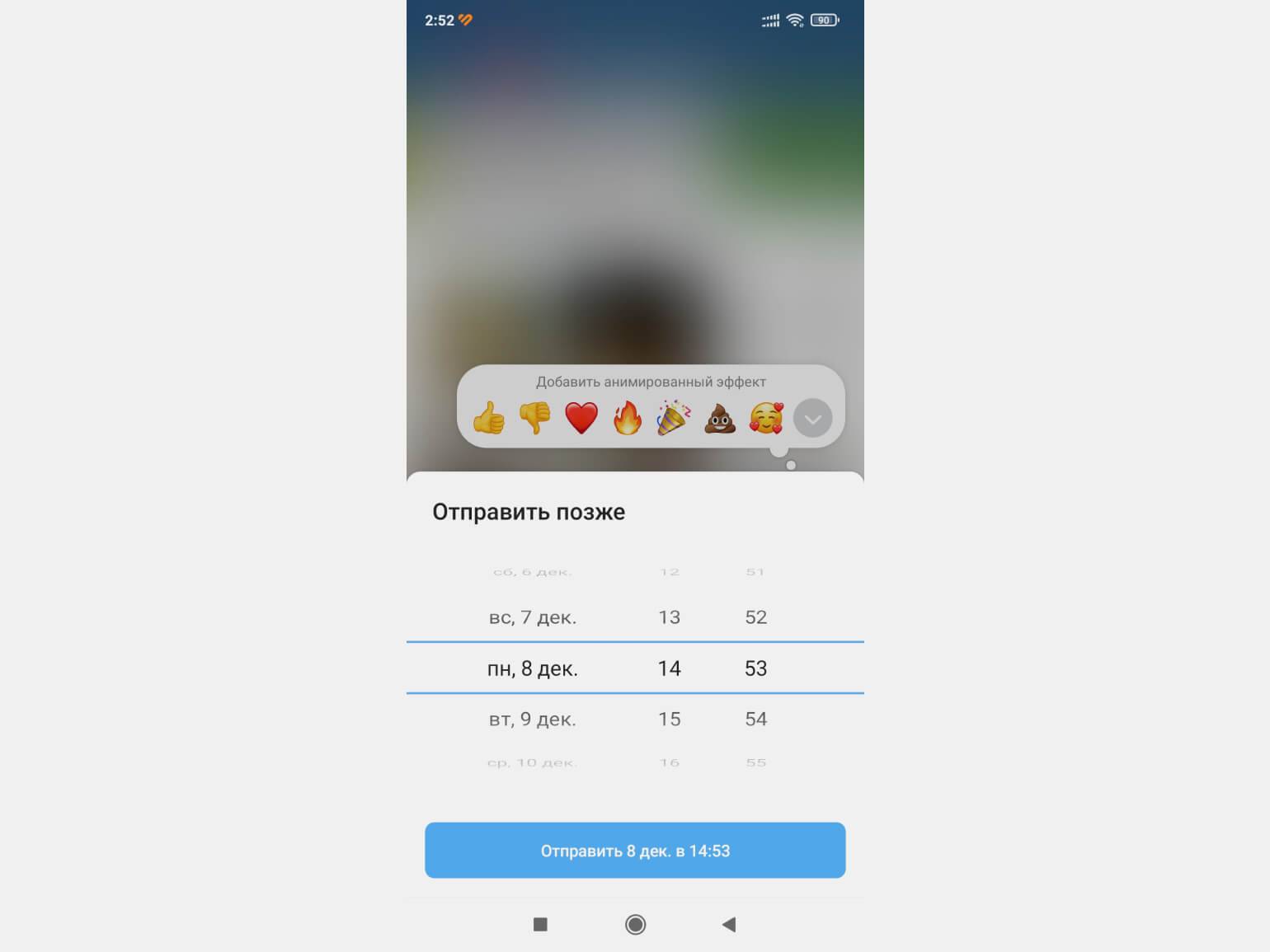 Так же можно запланировать репост. А чтобы отправить позже голосовое или видеосообщение, после записи нажмите на паузу, зажмите значок отправки и выберите «Отправить позже».