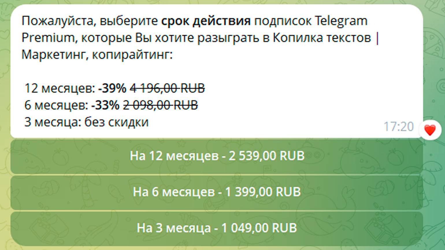 Подписку можно оформить на разные сроки — например, на месяц или год. Если не продлить подписку по истечении этого срока, аккаунт автоматически вернётся к обычной версии Telegram.