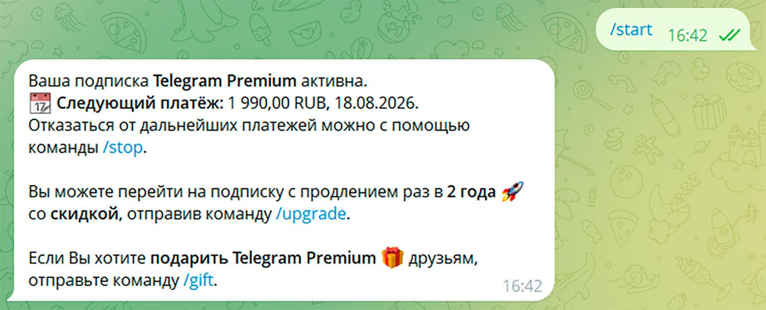 Посмотреть, до какого периода действует подписка, можно через Premium Bot: для этого нужно нажать на кнопку /start или ввести эту команду в диалоговое окно.