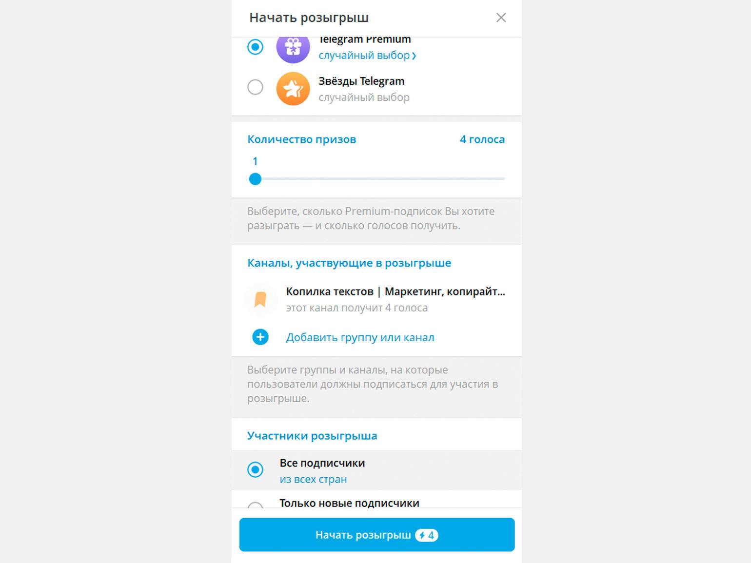 • Выберите канал или группу, в которых планируете розыгрыш.