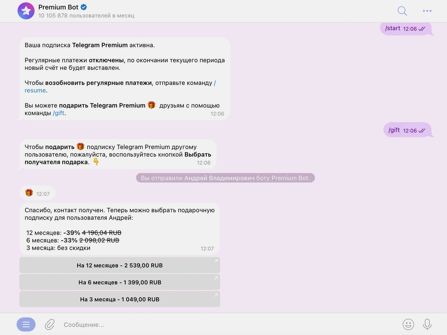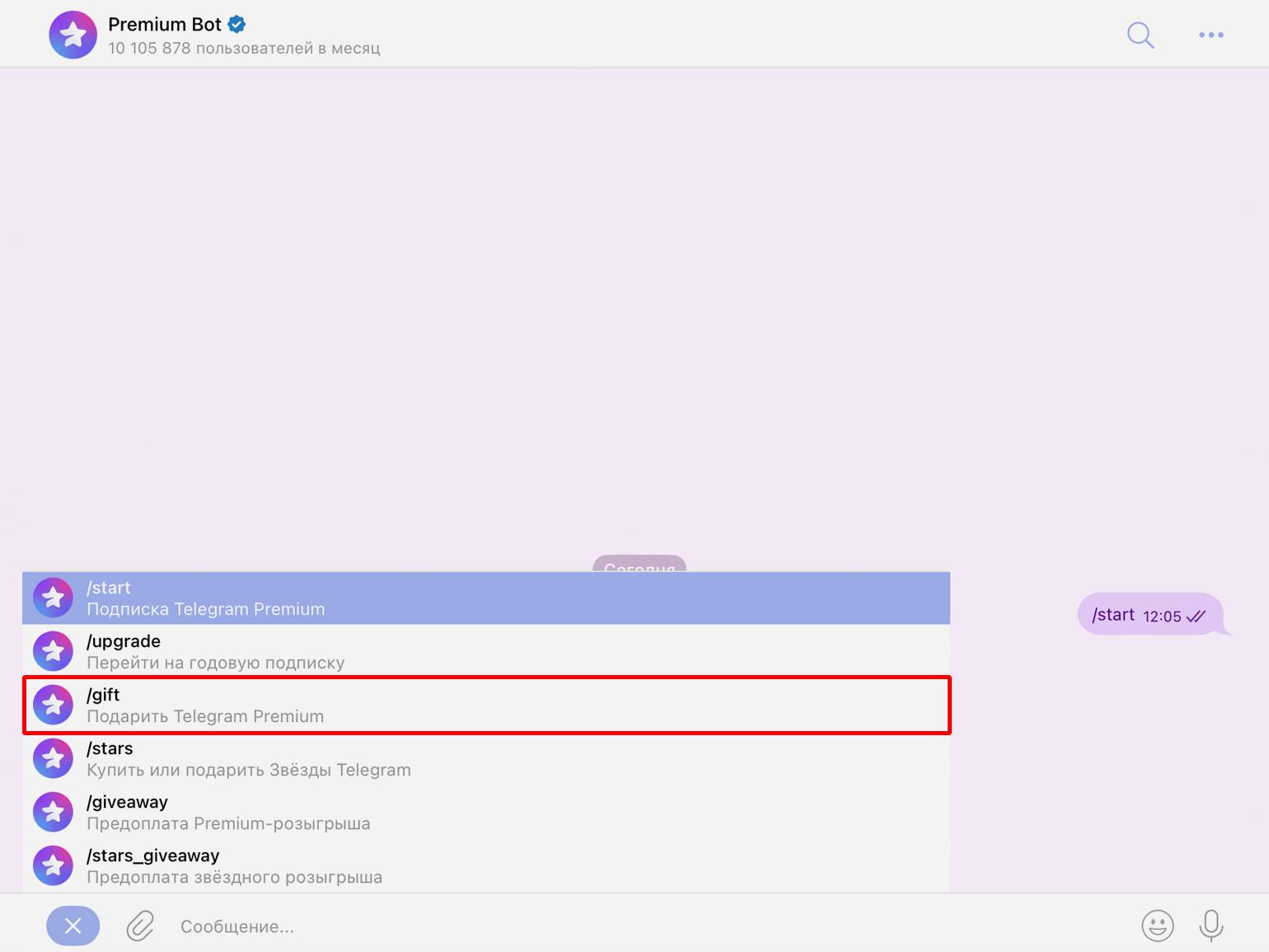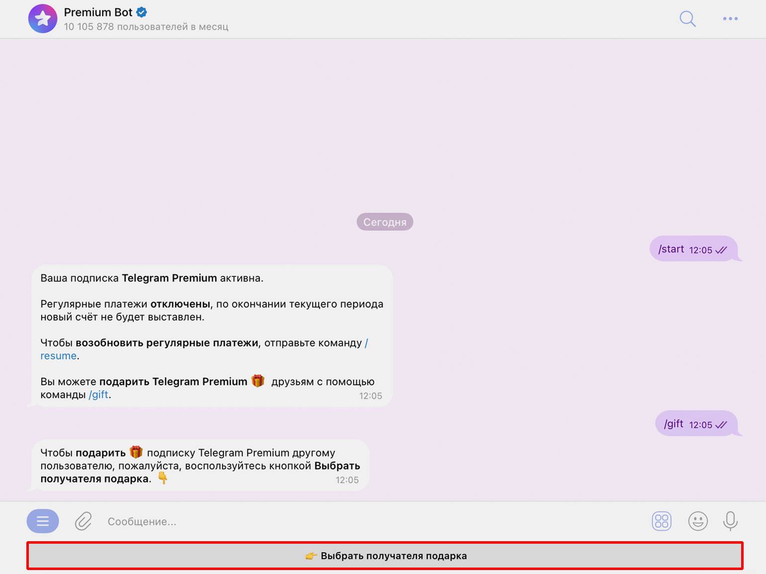 В меню бота нажмите на команду «Подарить Telegram Premium» и выберите получателя подарка.
