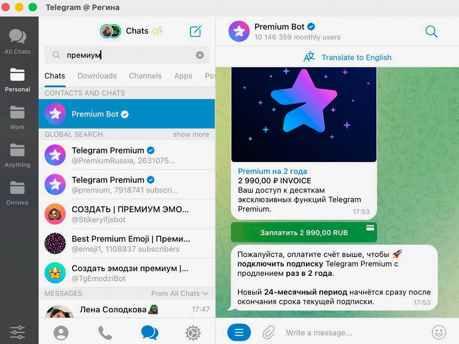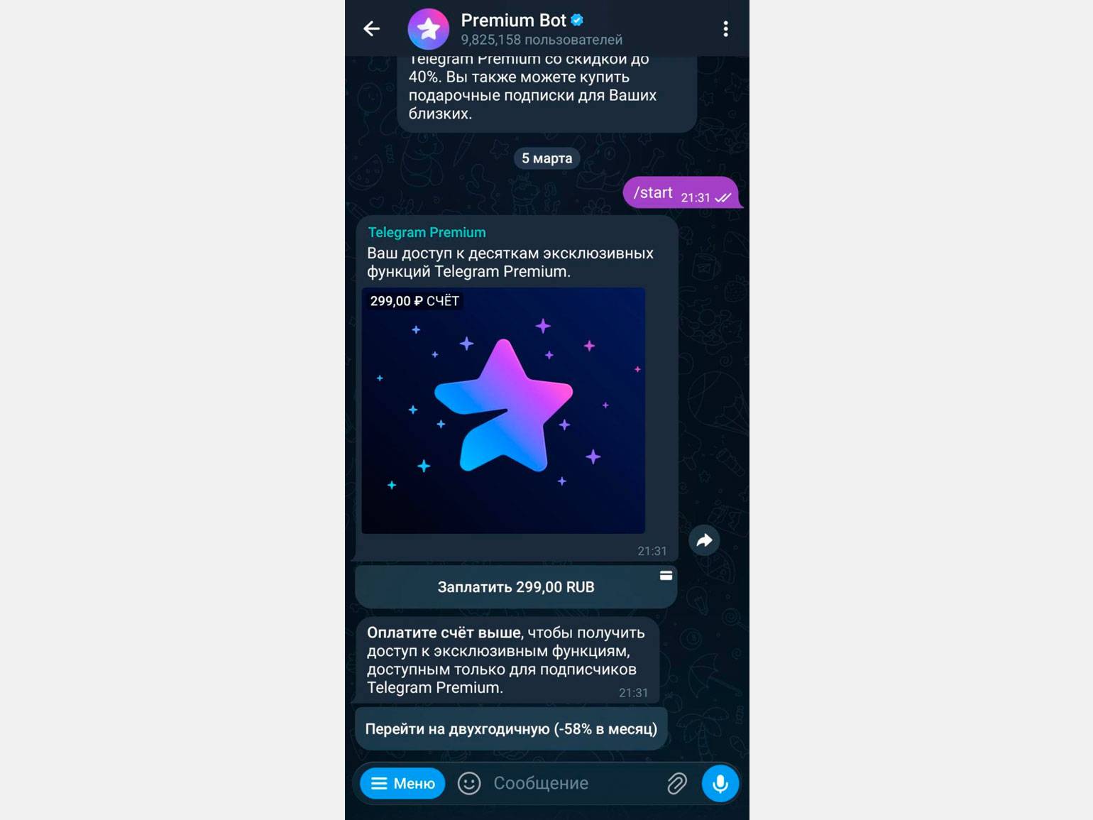 Следуя инструкциям бота, оплатите Telegram Premium — через SberPay или банковской картой. После оплаты вам станут доступны все функции подписки, а рядом с именем в профиле появится значок Premium.