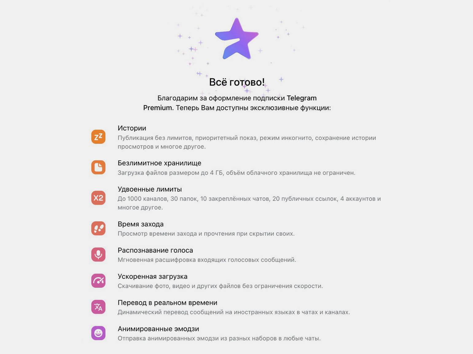 Следуя инструкциям бота, оплатите подписку. После этого вы можете пользоваться Telegram Premium без ограничений.
