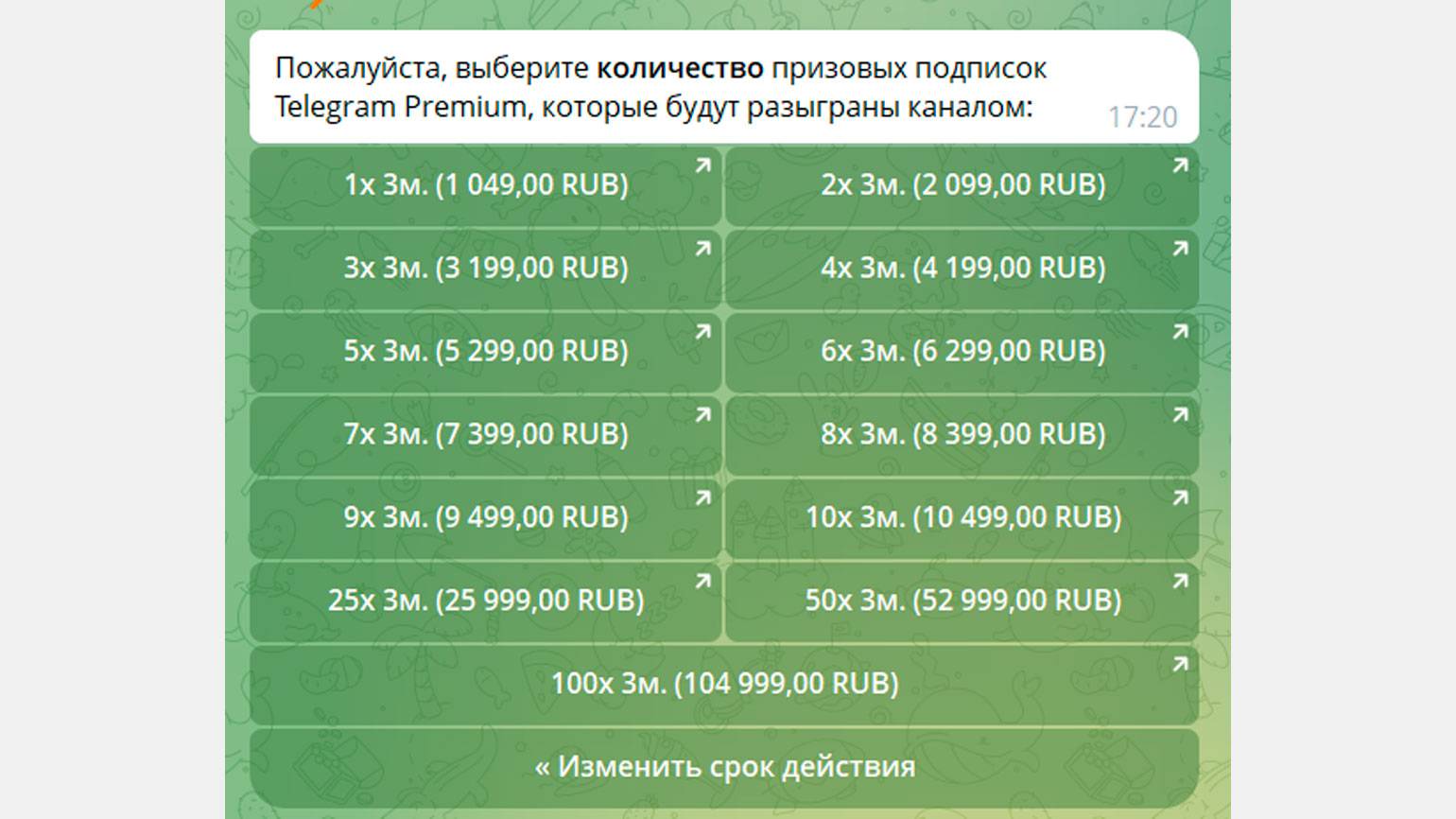 • Выберите количество призовых премиум-подписок, которые будут разыграны каналом, — от 1 до 100 — и оплатите их.