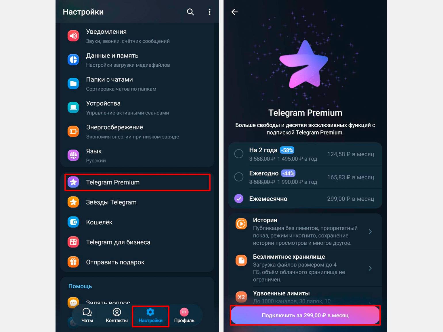 Зайдите в «Настройки» и выберите пункт Telegram Premium. В появившемся окне выберите срок действия подписки и нажмите кнопку «Подключить» — приложение перенаправит вас в Premium Bot.