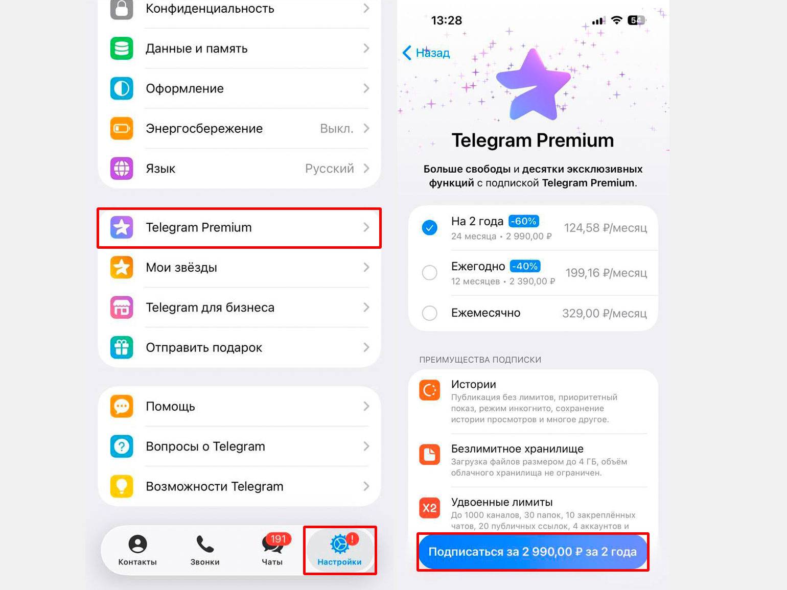 Подписку Telegram Premium можно оформить на месяц, три месяца, год или два года. Стоимость различается в зависимости от операционной системы устройства — например, на iPhone годовая подписка дороже, чем на смартфонах с Android, а ежемесячная подписка, наоборот, дороже на Android-смартфонах.