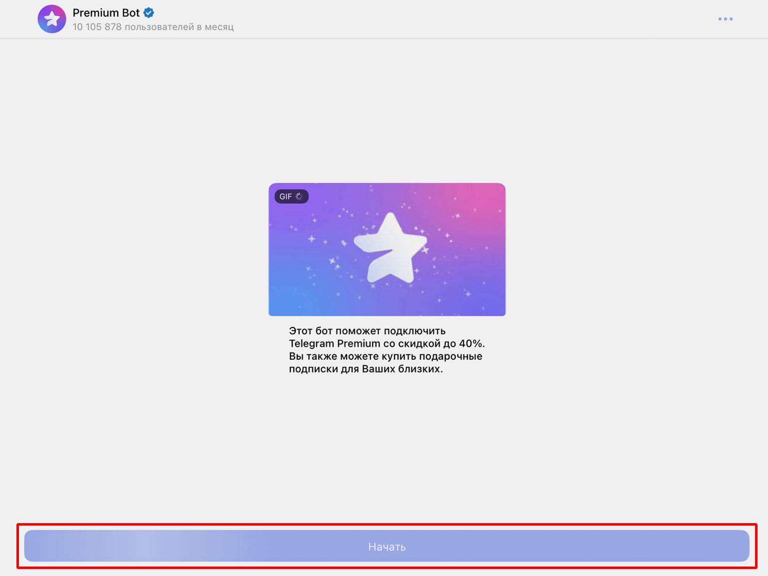 Подарить Telegram Premium другому пользователю можно так же через официального бота. Откройте Premium Bot — с компьютера или смартфона, — и нажмите кнопку «Начать».