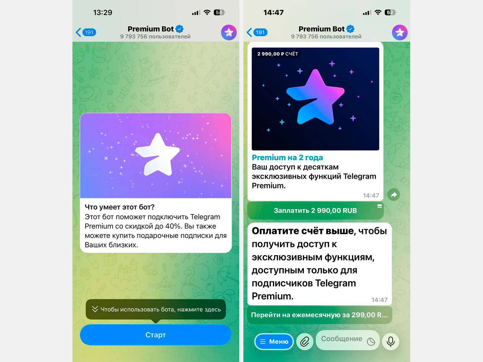 Также Telegram Premium можно оформить сразу через бота. Через поисковик Telegram найдите Premium Bot и нажмите кнопку /start. В меню бота выберите срок действия подписки и оплатите её.