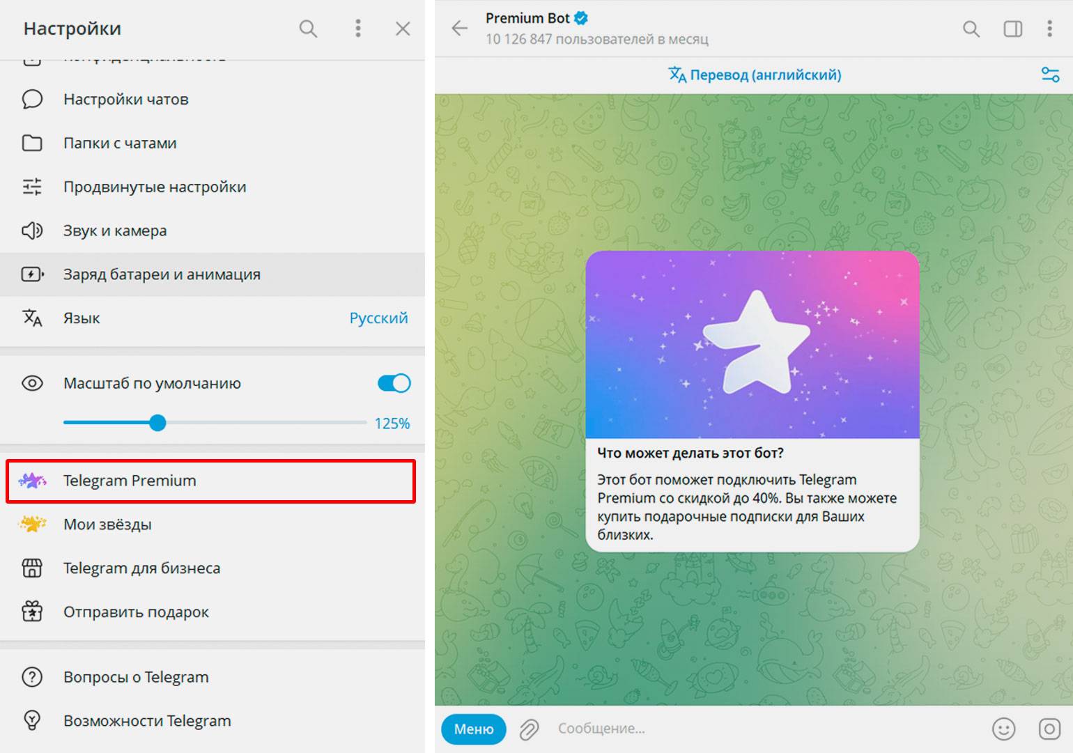 Зайдите в настройки профиля и выберите пункт Telegram Premium. В появившемся окне выберите срок действия подписки и нажмите «Подписаться» — после этого откроется Premium Bot.