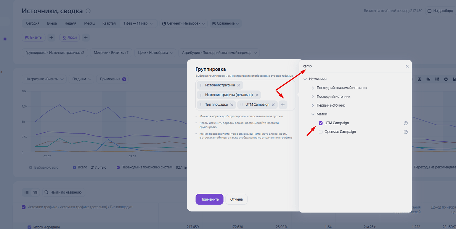 Чтобы отчёт можно было детализировать, добавьте группировку следующего уровня. В разделе «Группировка» нажмите на значок «+», в появившемся поле введите название нужной группировки и нажмите «Применить». У меня это UTM Campaign.