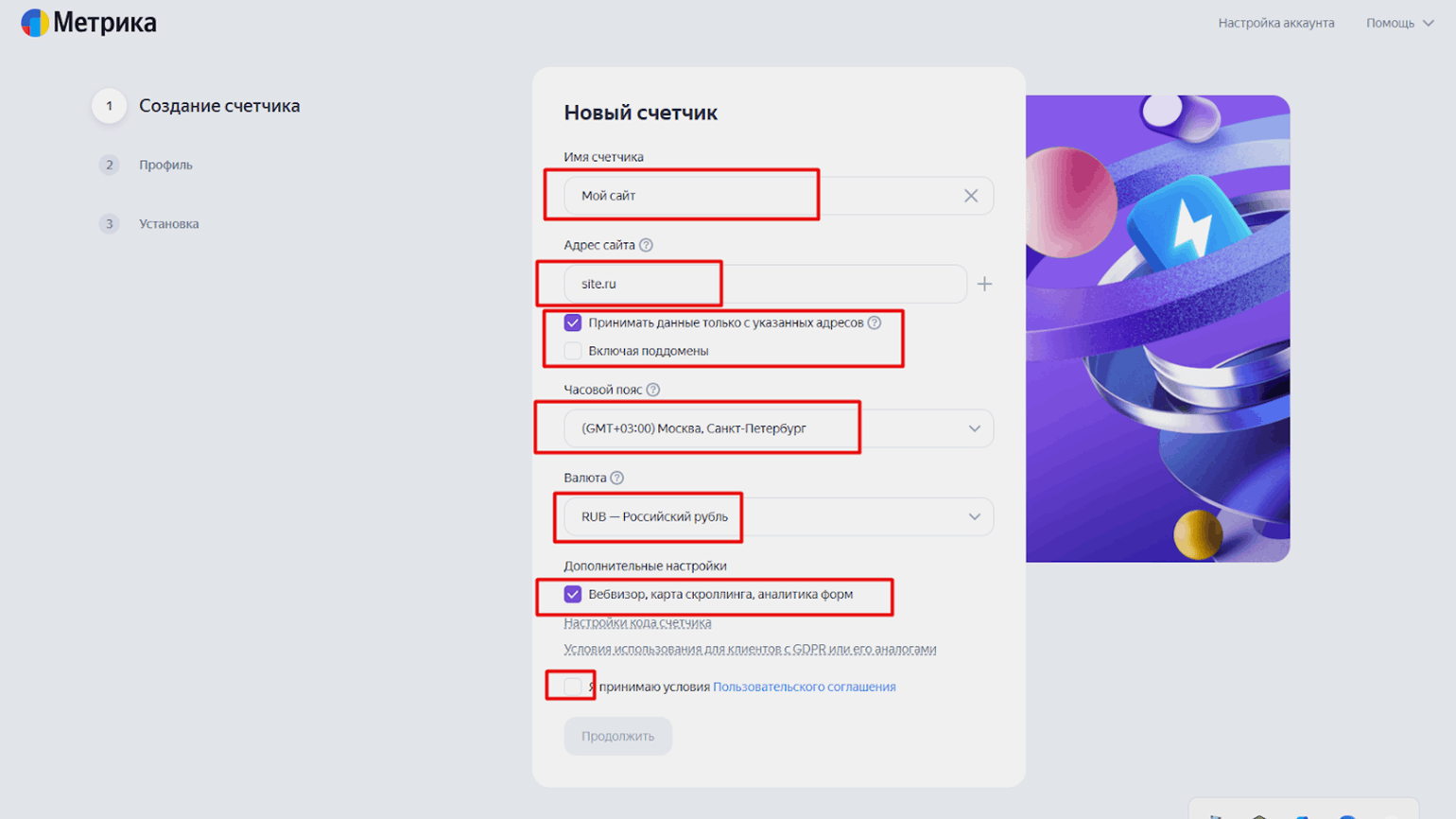 Чтобы создать счётчик, зайдите в «Яндекс Метрику» и заполните форму.