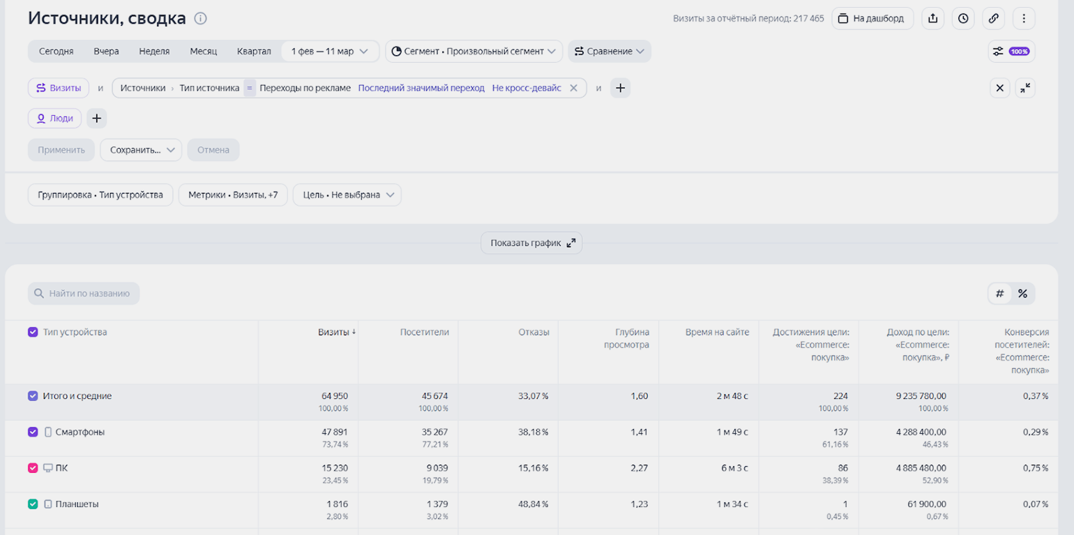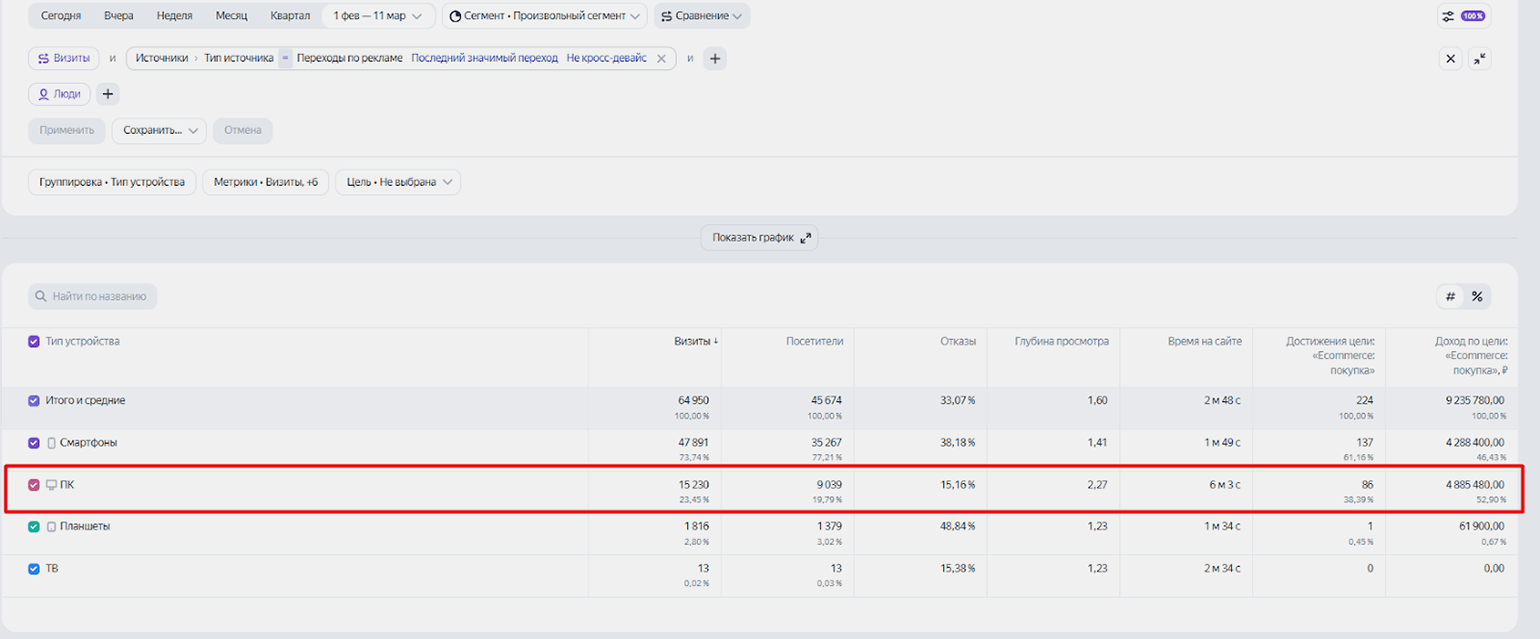 Таким образом, всего за несколько минут с помощью конструктора отчётов «Яндекс Метрики» удалось определить, что трафик с рекламы на ПК более чем в два раза эффективнее трафика с мобильных устройств. На основе этих данных можно сформировать гипотезу о том, что увеличение доли трафика с ПК может сделать рекламные вложения более эффективными.