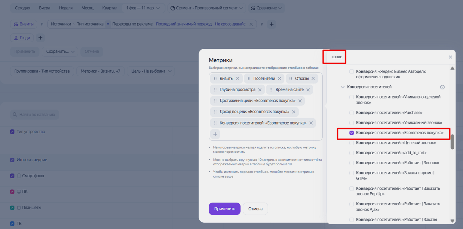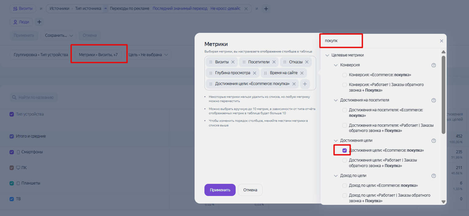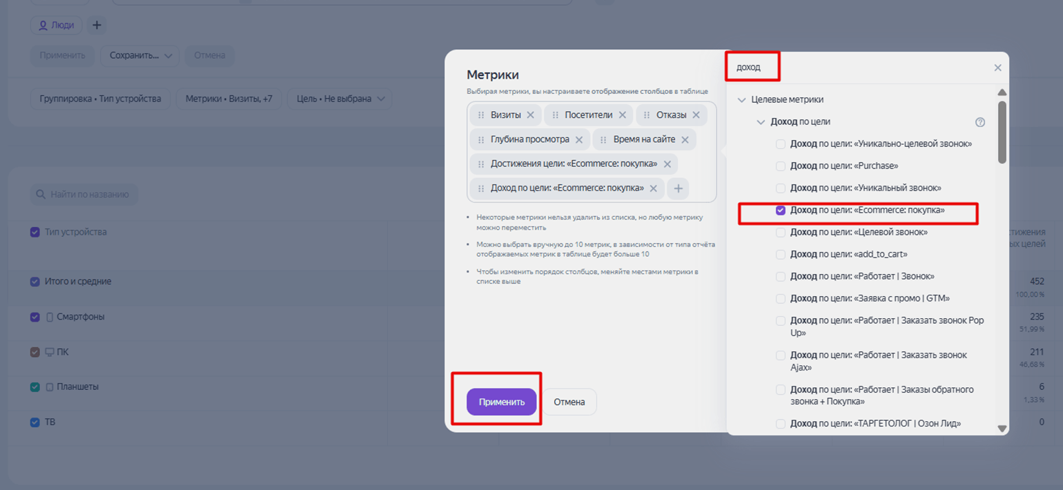 Далее нажмите на «Метрики», удалите метрики по избранным целям и, используя поисковую строку, добавьте метрику «Достижение цели „Ecommerce: покупка“». Также добавьте метрику «Доход» — так вы сможете понять, с каких устройств пользователи оформляют более крупные заказы.