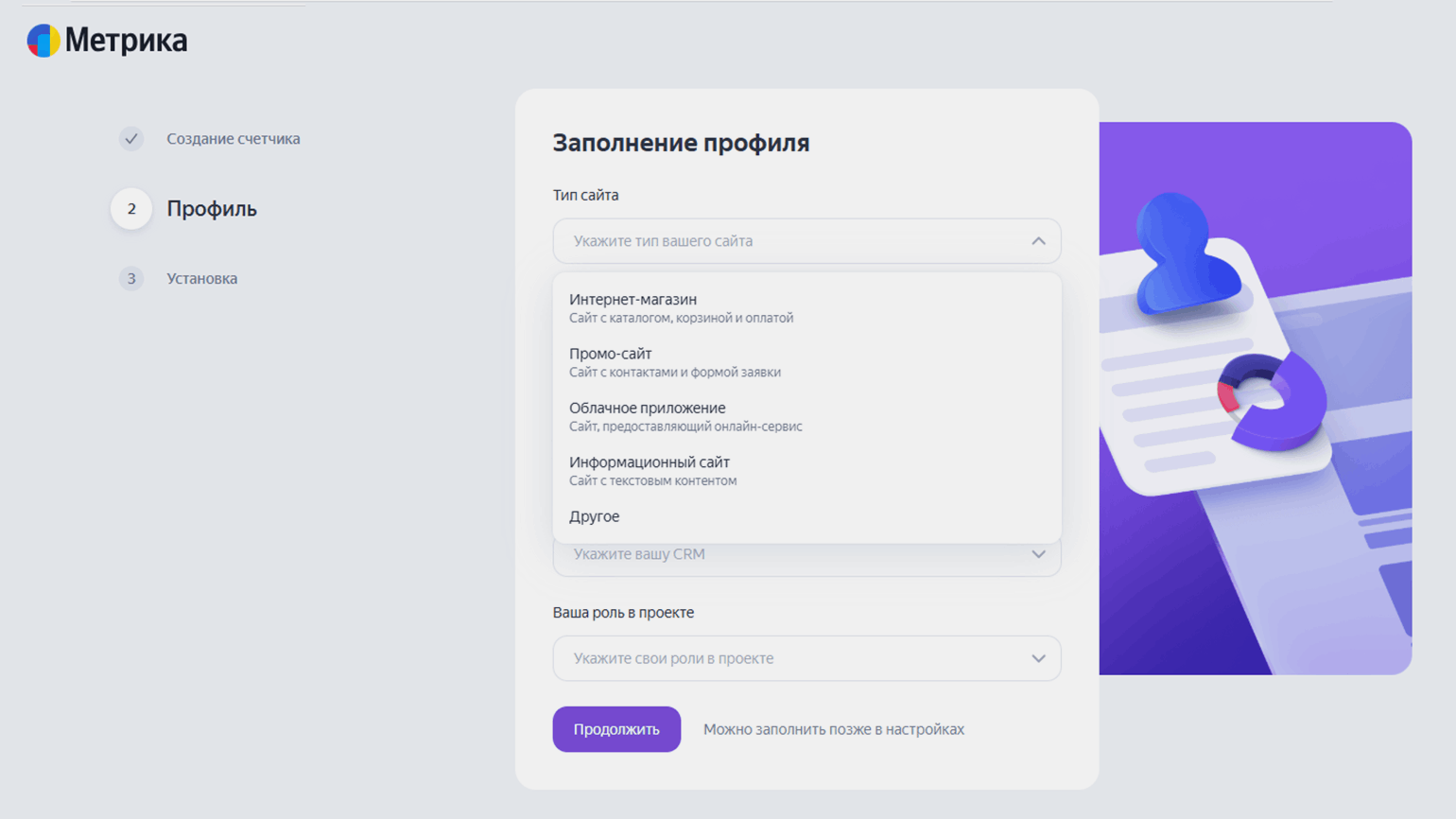 На втором шаге анкеты нужно ввести общие данные: тип сайта, информация о компании и вашей роли в проекте.