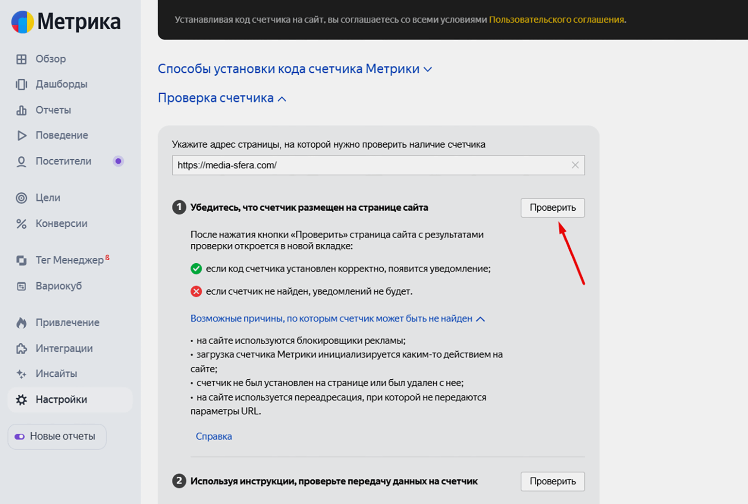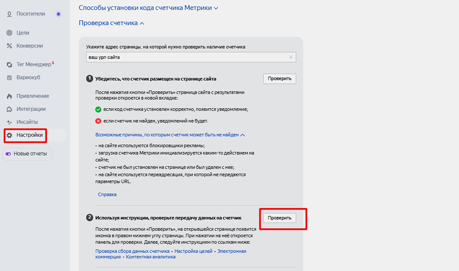 После того как программист внесёт изменения в код, нужно убедиться, что цель работает корректно. Для этого перейдите в «Настройки» → «Счётчик», прокрутите страницу вниз под блок с кодом счётчика и нажмите кнопку «Проверить» напротив второго пункта.