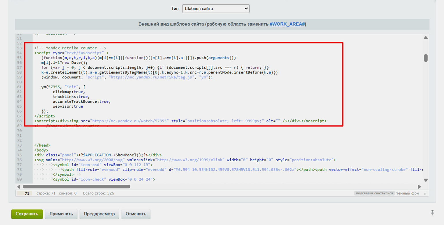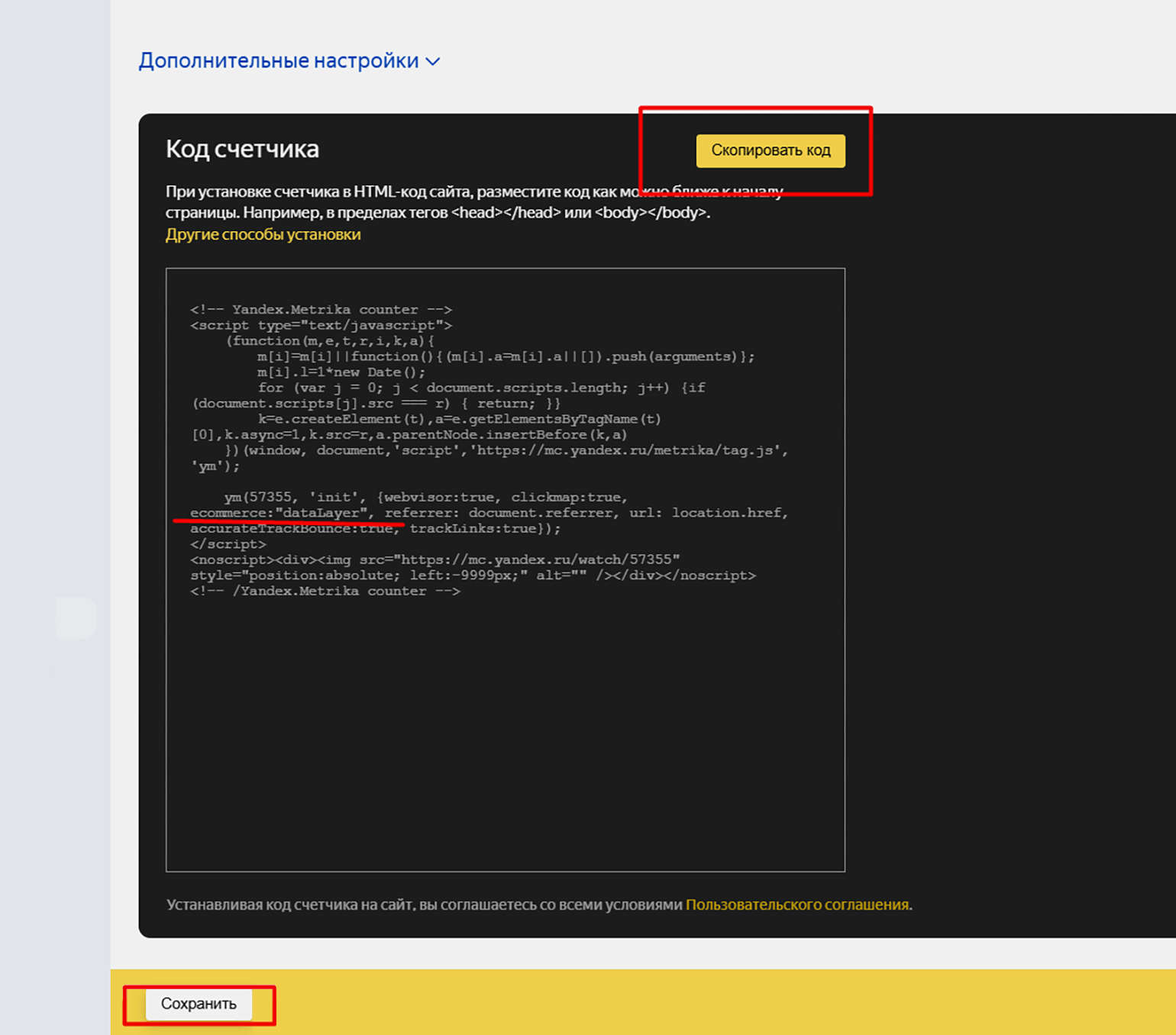 Это действие добавит дополнительную строку в код счётчика «Яндекс Метрики», после чего его нужно будет обновить на сайте. Для этого прокрутите страницу ниже, скопируйте обновлённый код и нажмите «Сохранить».