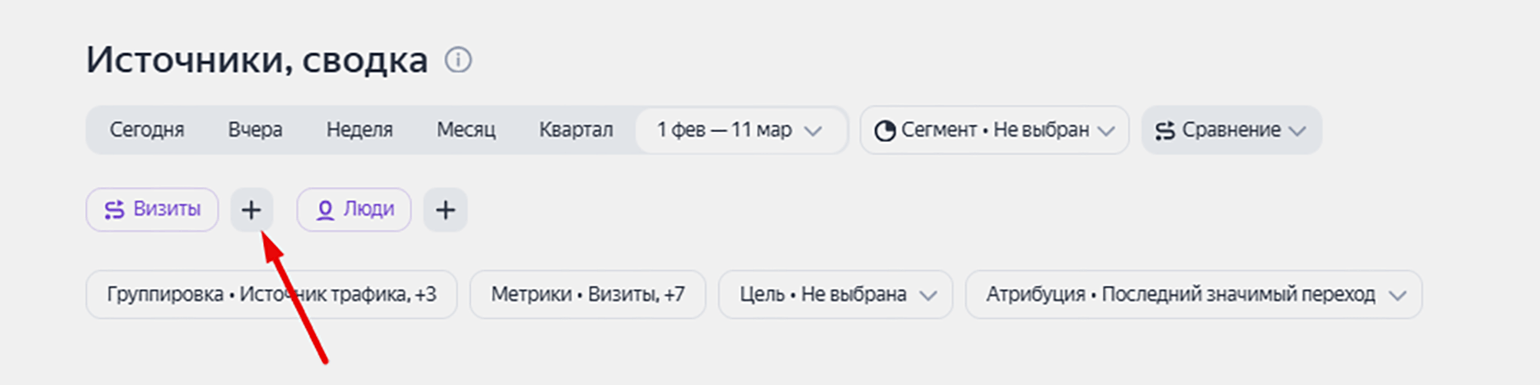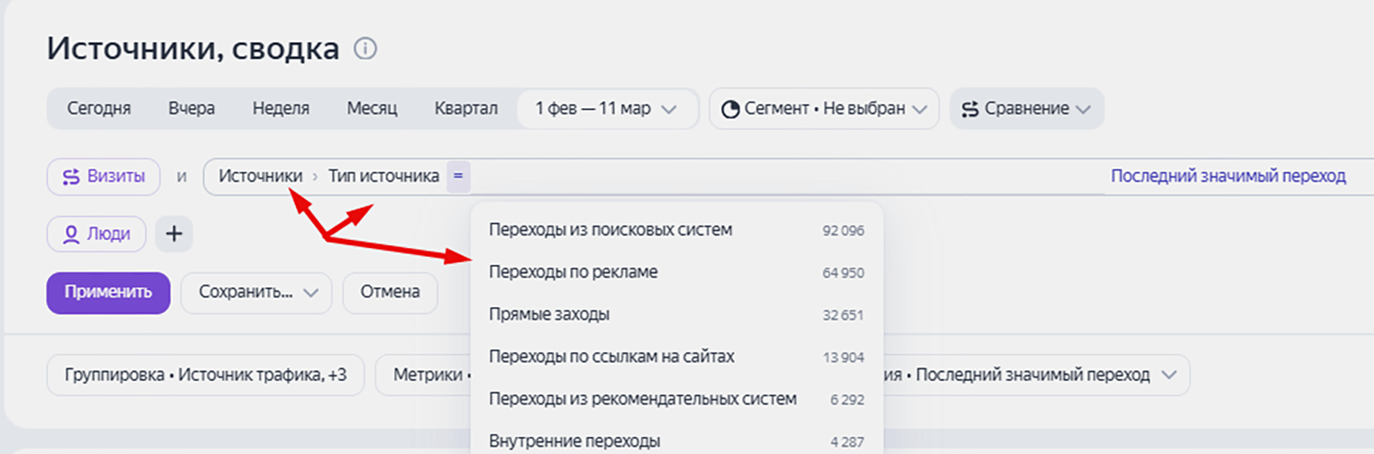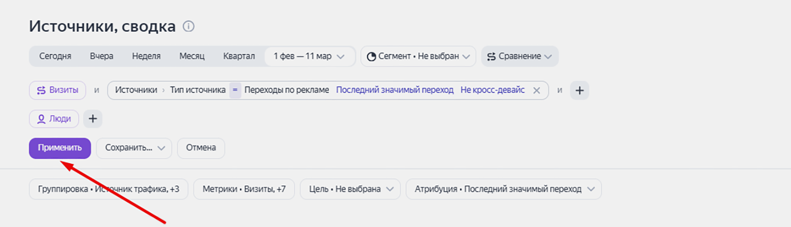 Ещё в отчёте можно оставить только интересующие вас данные. Для этого можно воспользоваться фильтром: нажмите на значок «+» рядом с надписью «Визиты», далее — «Источники» → «Тип источника» → «Переходы по рекламе». В конце нажмите «Применить».