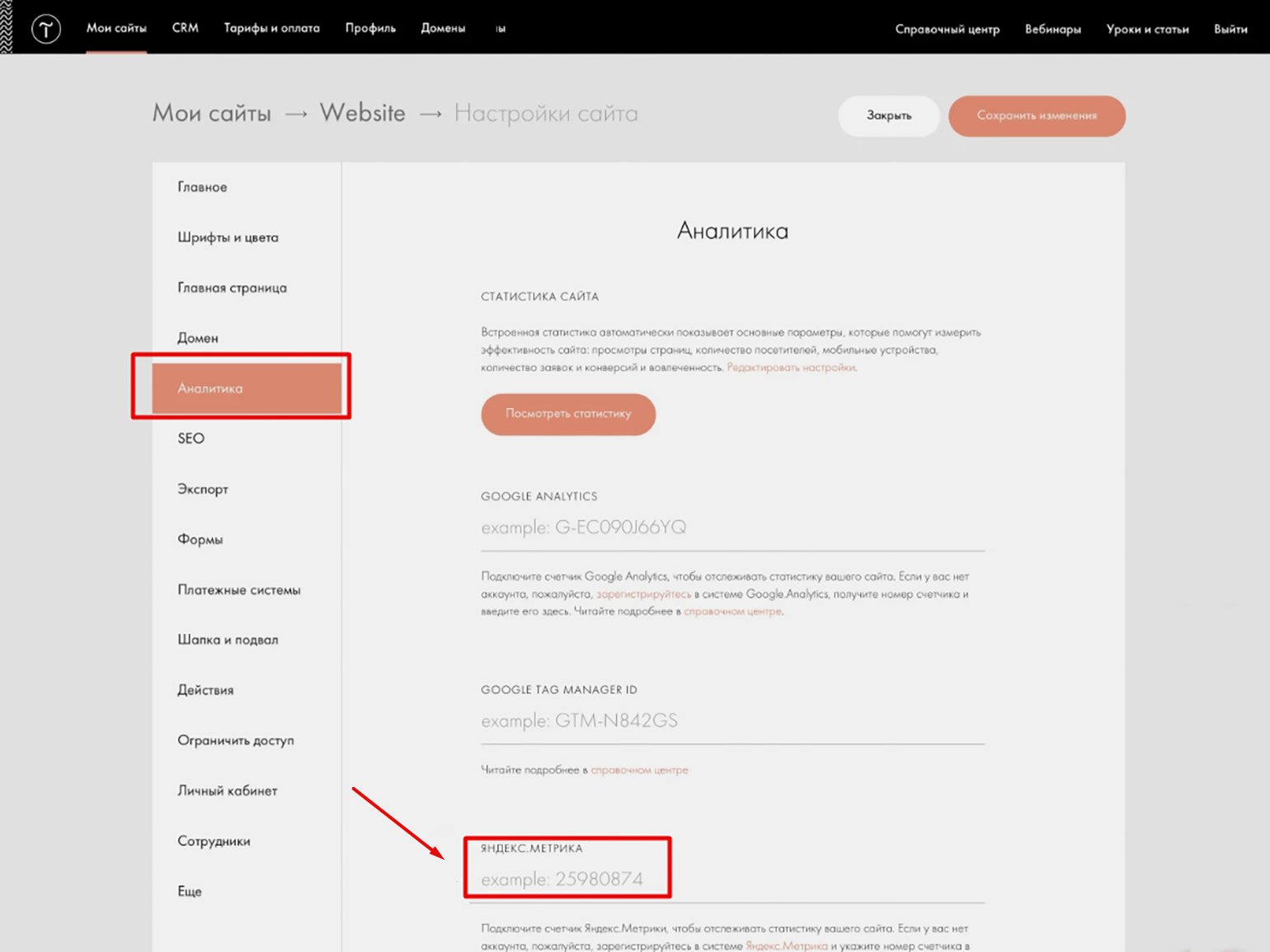 Если сайт сделан с помощью конструктора — например, Tilda — или с использованием популярных CMS, счётчик можно подключить через их интерфейс. Для этого нужно скопировать и вставить номер счётчика в специальное поле в конструкторе и сохранить изменения.