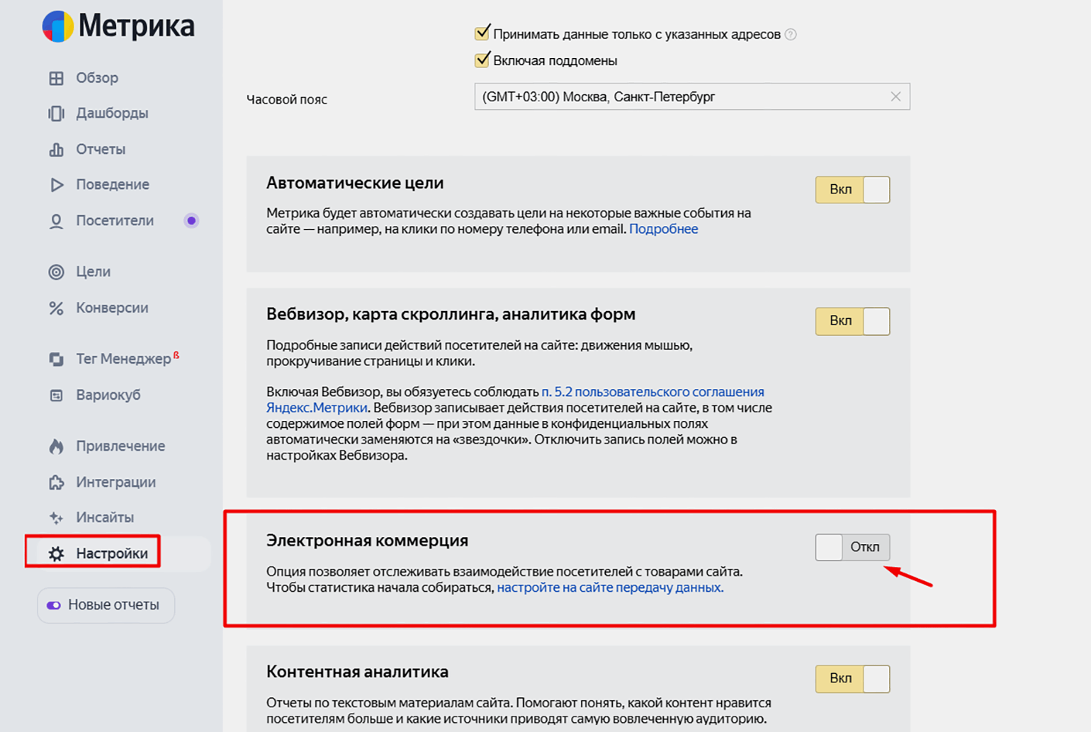 В первую очередь нужно активировать отчёты электронной коммерции. Для этого в «Яндекс Метрике» перейдите в раздел «Настройки» → «Счётчик» и переключите тумблер на «Вкл».