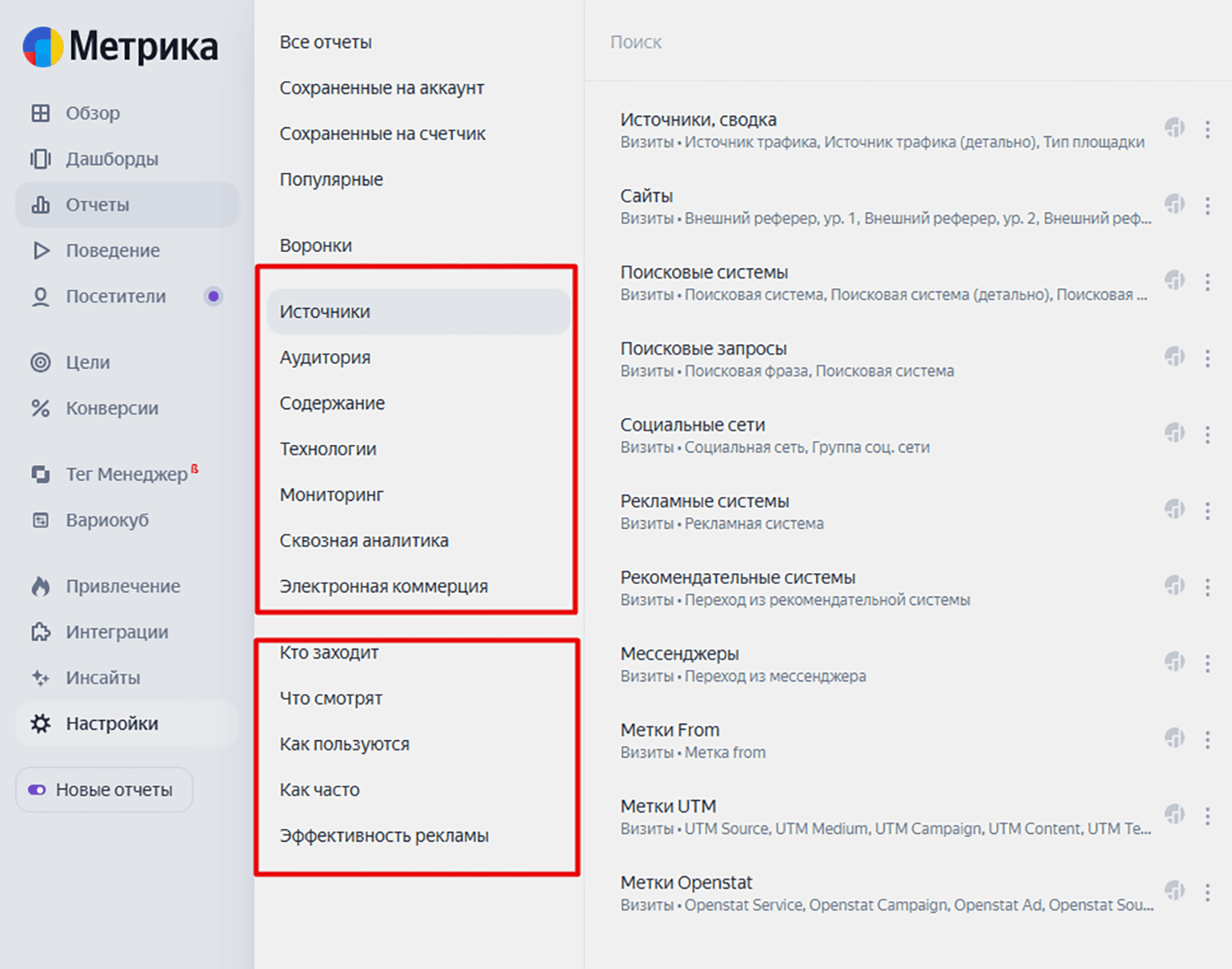 Детализированные данные можно смотреть в отчётах. Они сгруппированы по типам данных, например: «Источники», «Аудитория», «Содержание», «Технологии». Также есть блок с отчётами по задачам — например, «Кто заходит» или «Что смотрит».