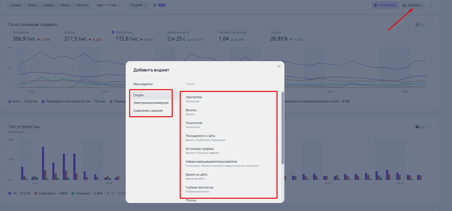 По умолчанию на дашборде уже есть виджеты с основными отчётами — их можно настроить под свои задачи. Для этого нажмите «Добавить» в правом верхнем углу и выберите показатели, которые хотите видеть на дашборде.