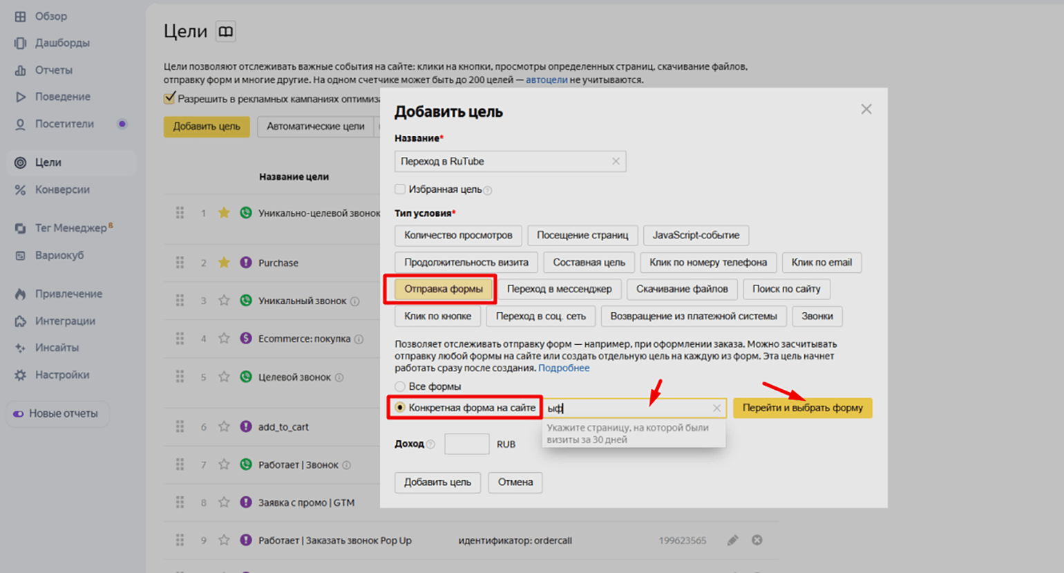 Если выбираете одну форму, укажите страницу, на которой она находится: нажмите «Перейти и выбрать» и следуйте подсказкам «Яндекс Метрики». В этом случае будут фиксироваться все клики по кнопке «Отправить» для выбранной формы.